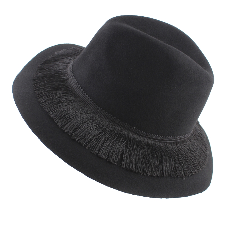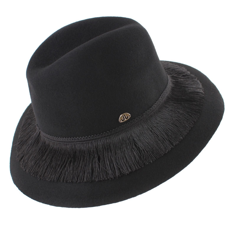 Ladies' felt fedora hat with medium wide brim and chic fringe decoration. Width of the periphery - 8 cm. Height of the dome: 12.5 cm. Composition: 100% wool. Size: available in one size 56/57 cm. Made in Italy.