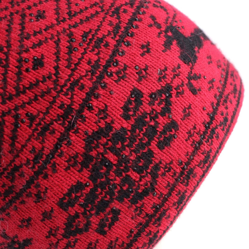 Soft knitted women's hat in red and black with a winter motif, decoration of small shiny stones and a natural pom pom.