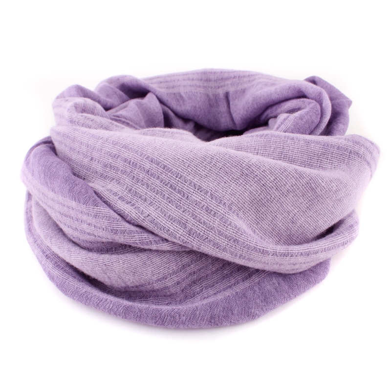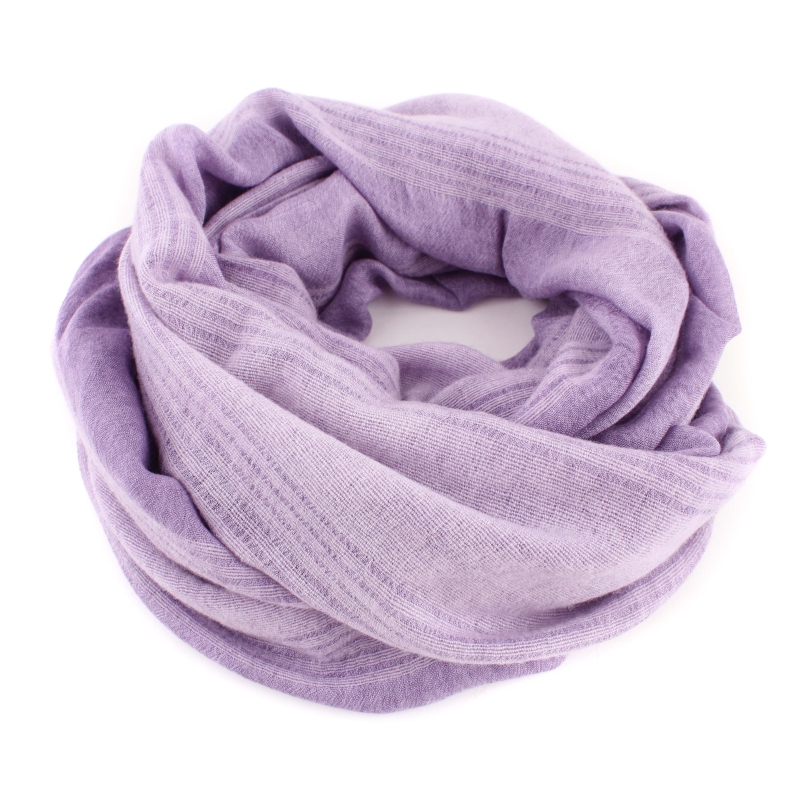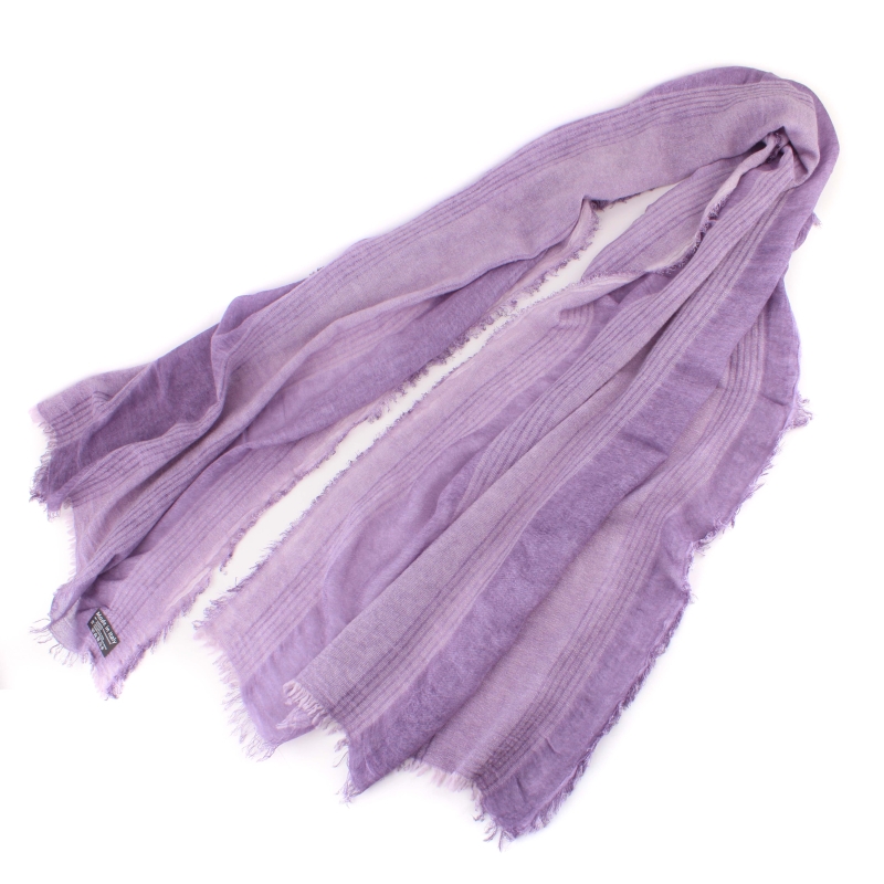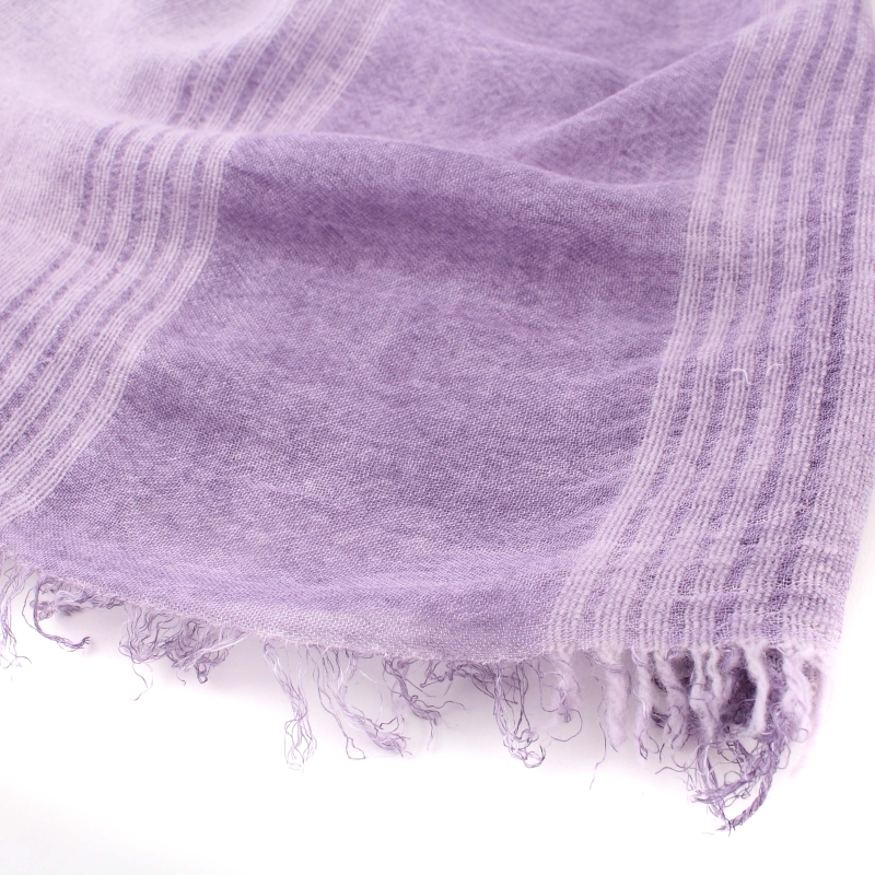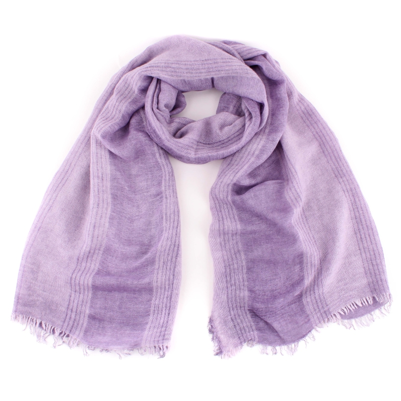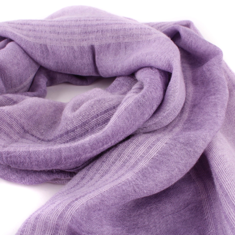 Fine scarf with longitudinal violet stripes and unfinished ends. The material is a blend of polyester, linen and viscose - durable, non-steaming and easy to maintain. The scarf is suitable for transitional seasons.
