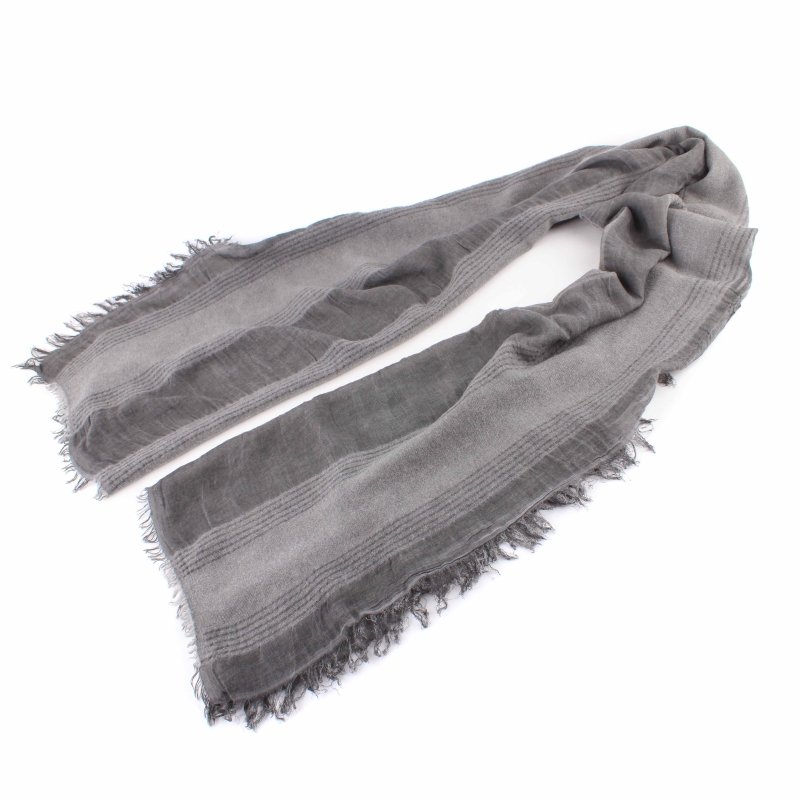 Fine scarf in longitudinal gray stripes and unfinished ends. The material is a blend of polyester, linen and viscose - durable, non-steaming and easy to maintain.