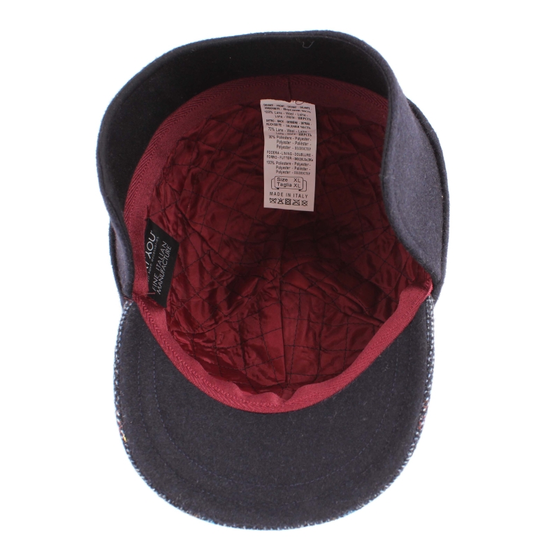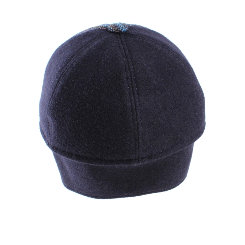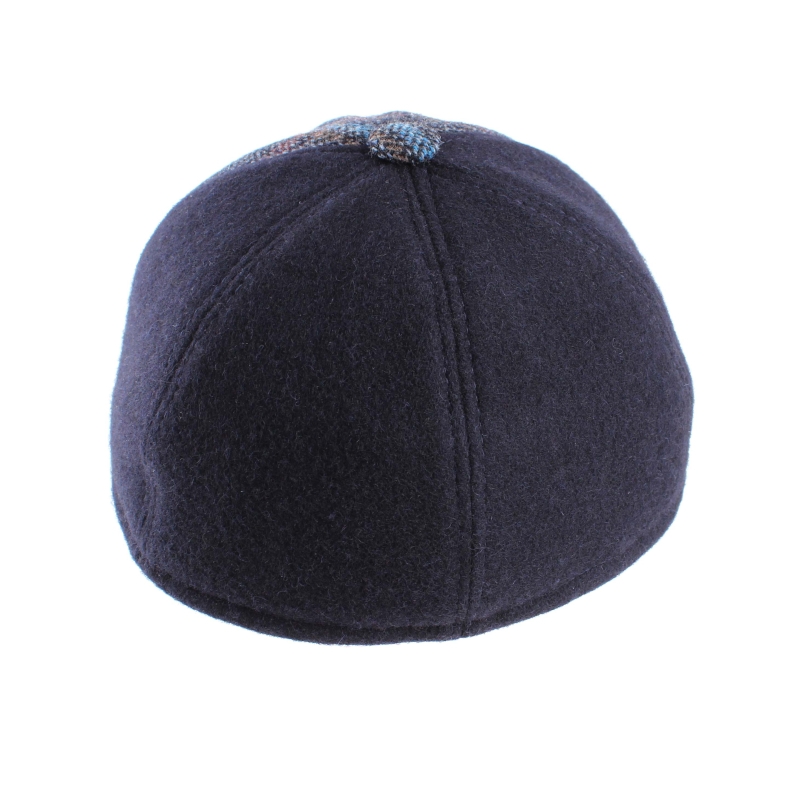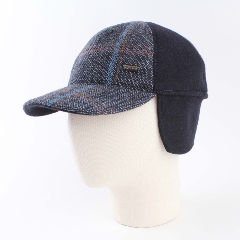 Men's wool cap with earmuff in navy blue and plaid. A warm hat with an extra piece of fabric that protects the ears and neck on colder winter days.