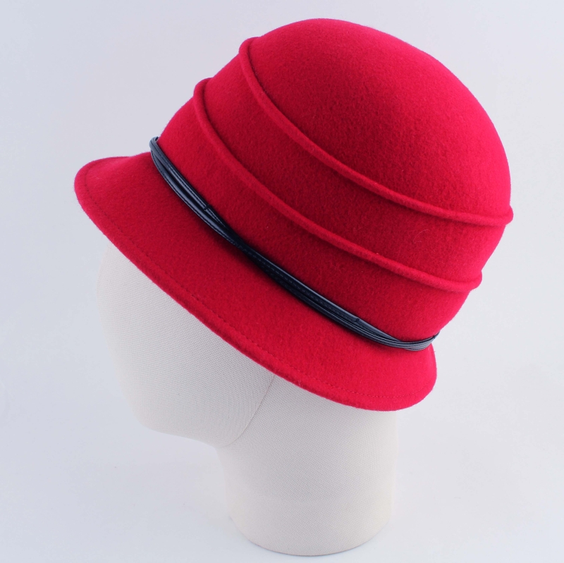 Elegant felt cloche hat in red with a black synthetic leather strap and a gold metal chain.