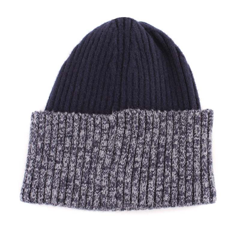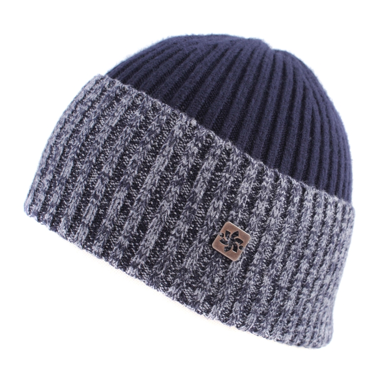 Soft men's knitted hat in navy blue and gray with ribbed knit made of fine yarn.