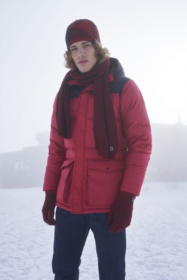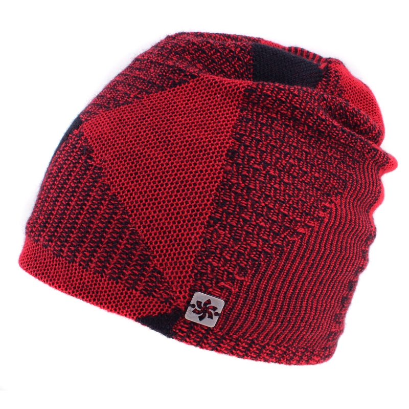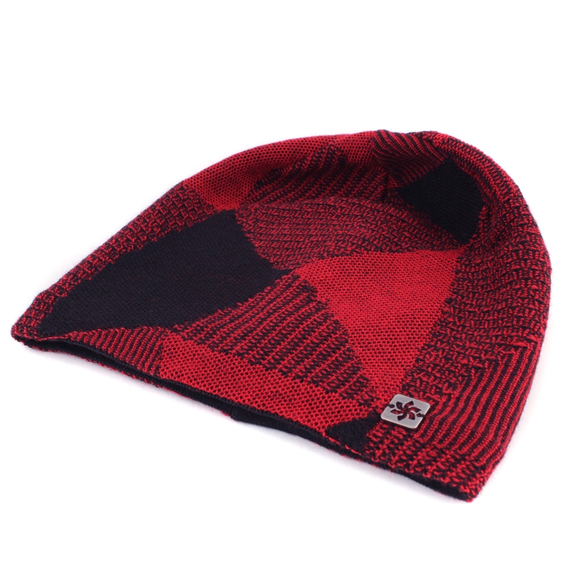 Men's knitted hat with a fine knit pattern and geometric motifs in red-black, featuring a soft fleece lining.
