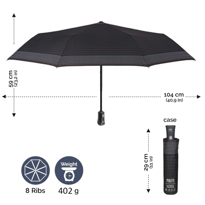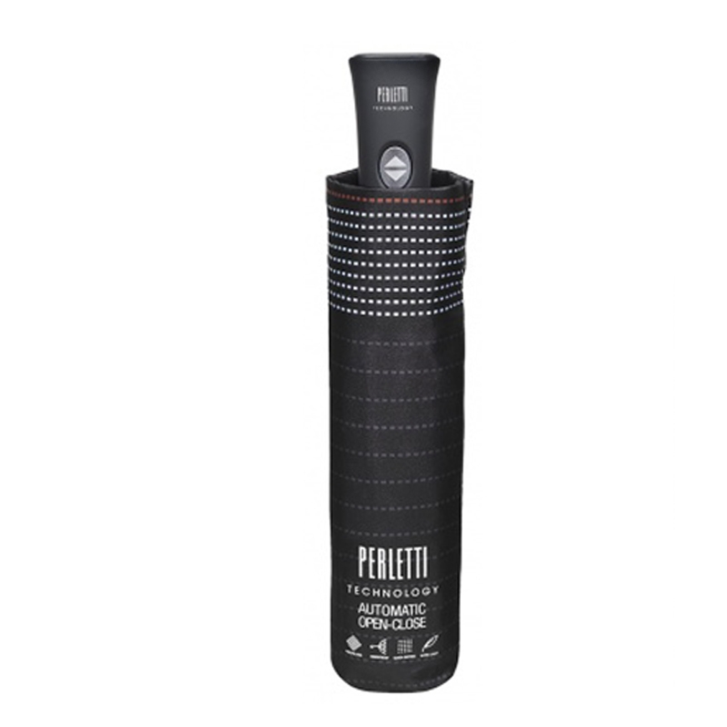 Foldable 3-section men's umbrella with automatic opening and closing, part of the Perletti Technology line.