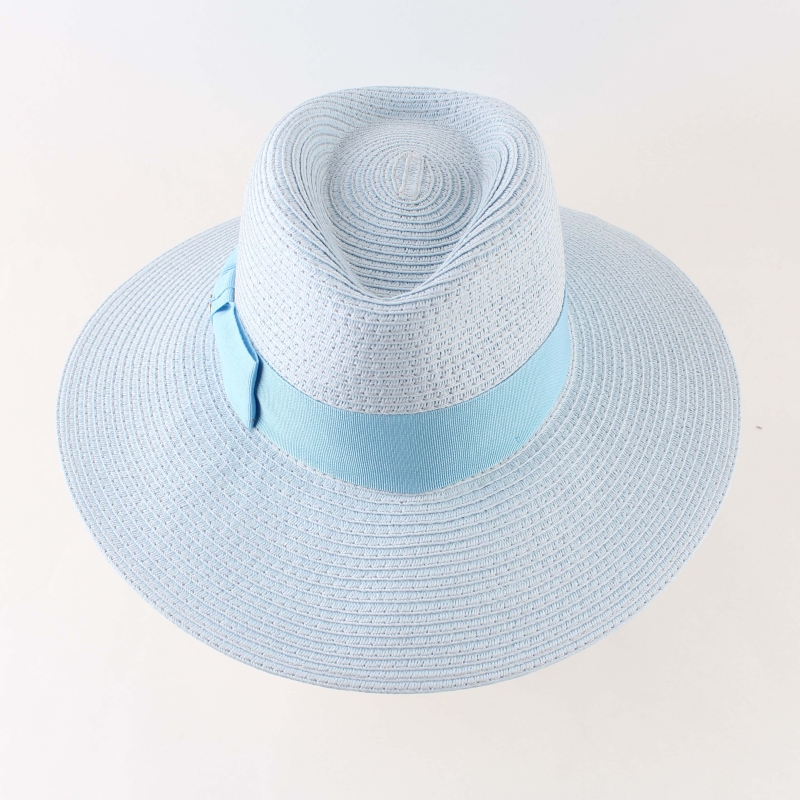 Ladies' wide-brim summer fedora hat in light blue with a matching decorative ribbon.