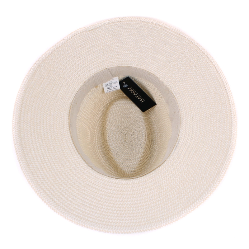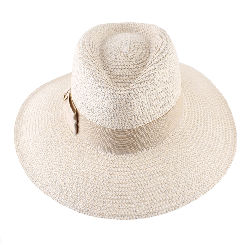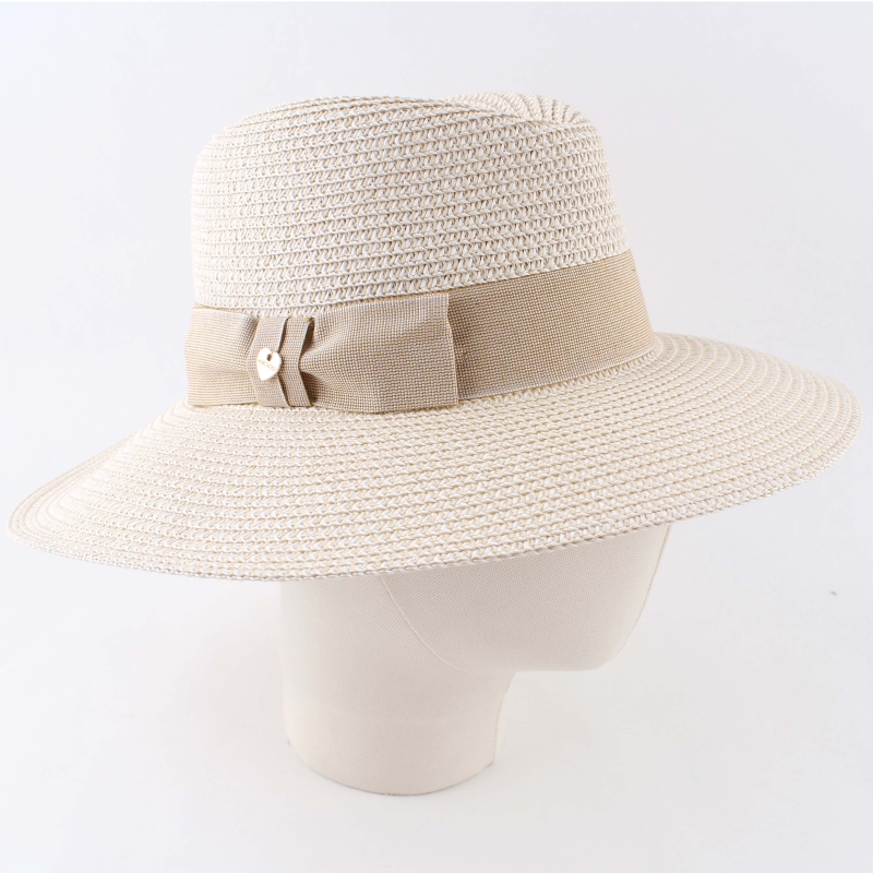 Ladies' wide-brim summer fedora hat in beige melange with a matching decorative ribbon.