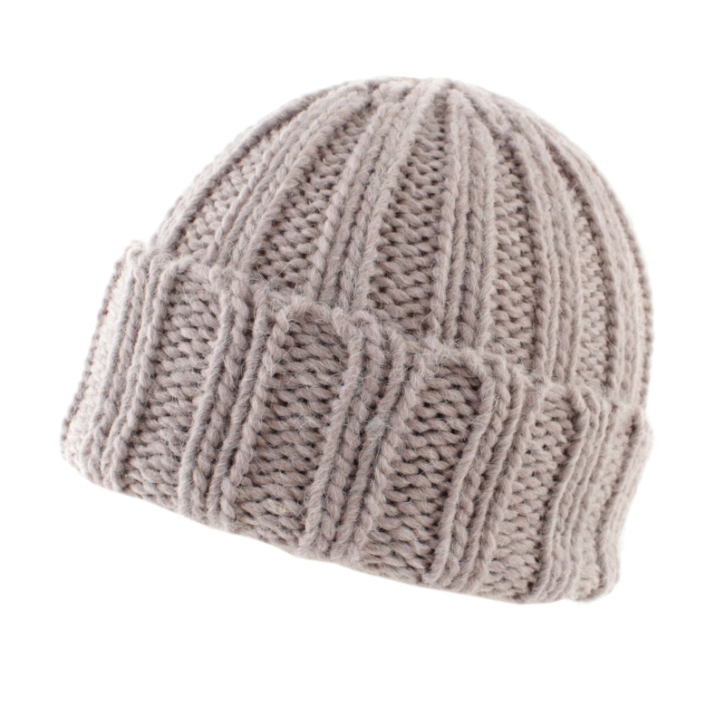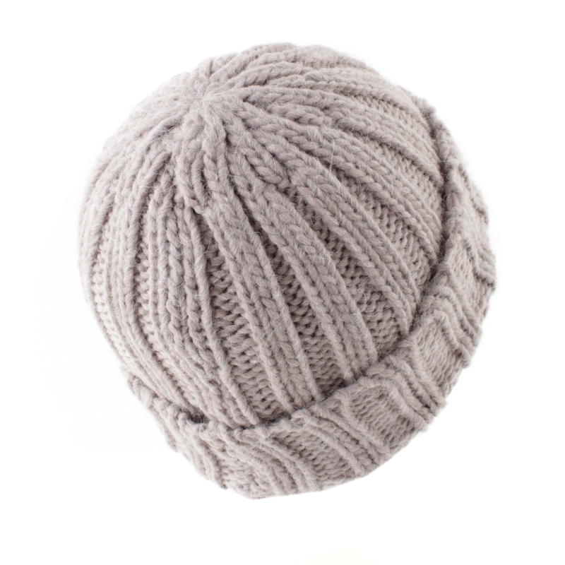 Comfortable knitted winter hat with a chunky elastic rib pattern and soft, voluminous yarn.