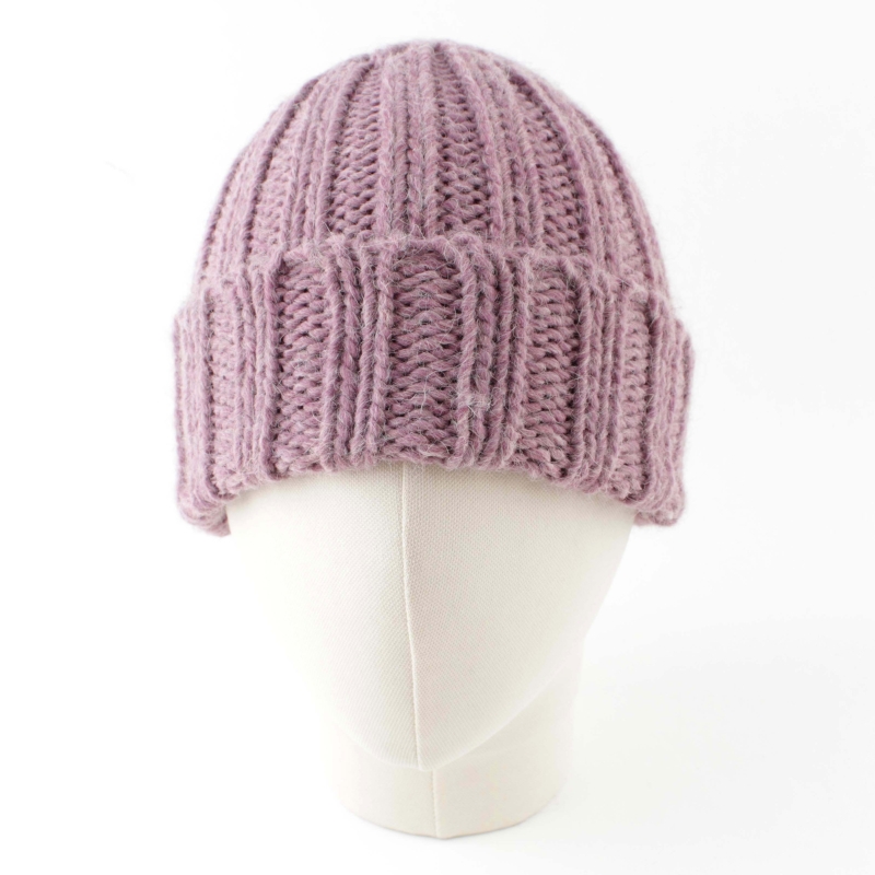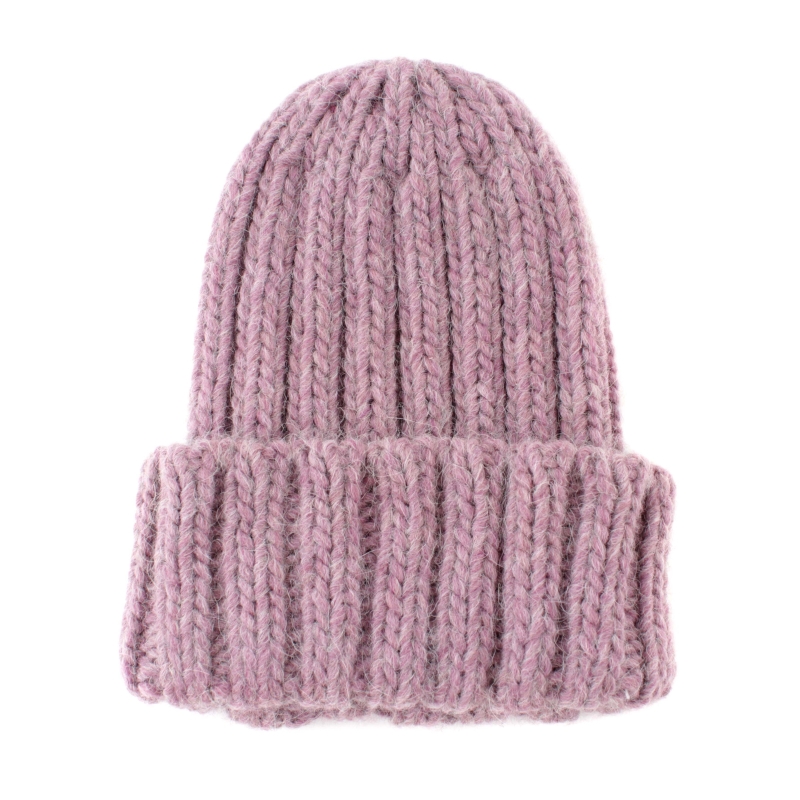 Comfortable knitted winter hat with a chunky elastic rib pattern and soft, voluminous yarn.