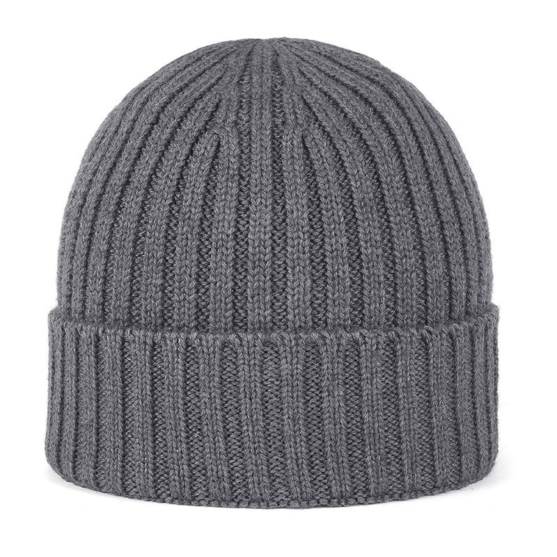 Men’s knitted hat with elastic ribbed pattern and folded brim, made from yarn blended with merino wool.