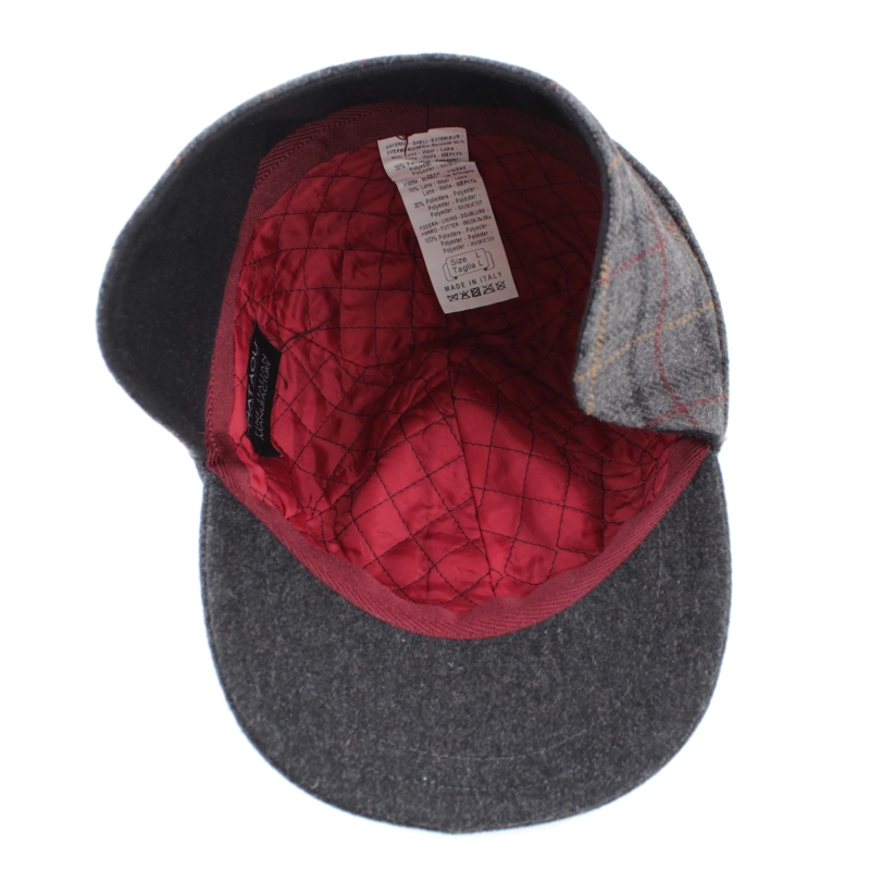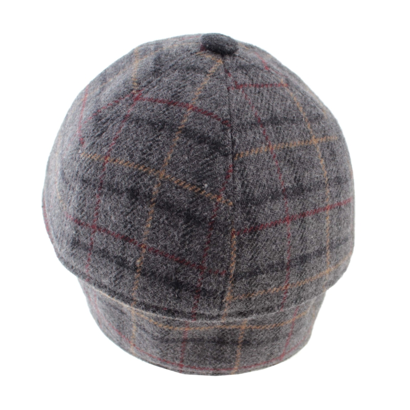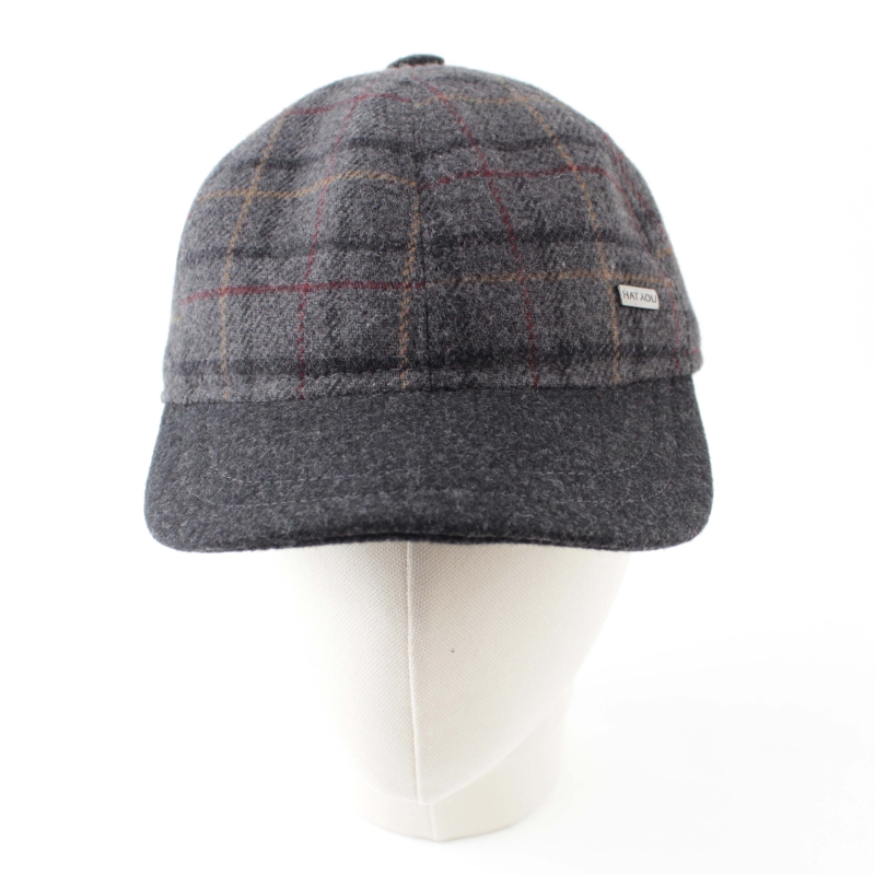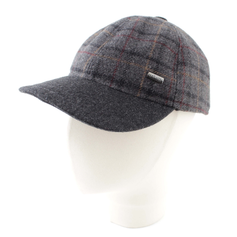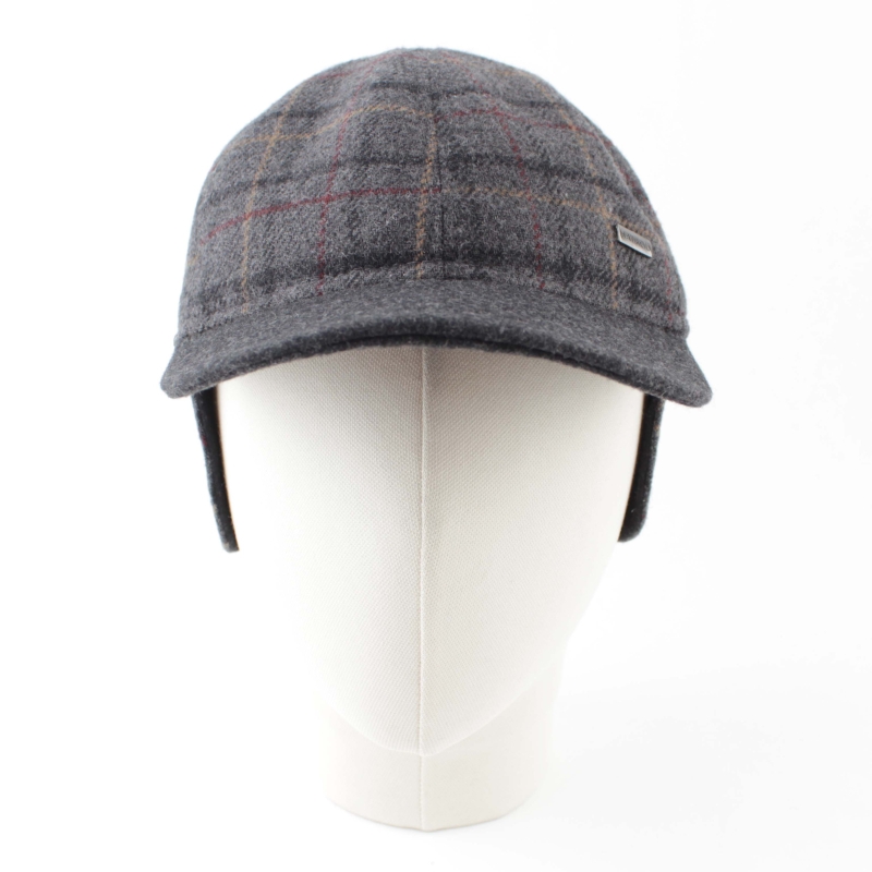 Men’s wool baseball cap with ear flaps, in dark grey check pattern.