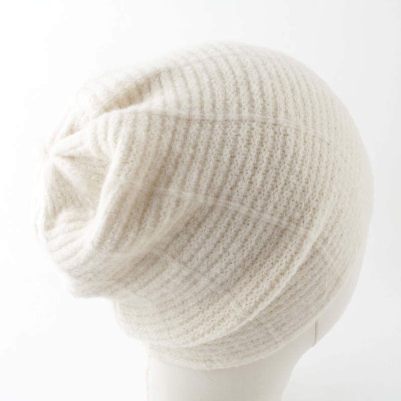 Knitted hat made of fine, fluffy yarn with a high wool content.