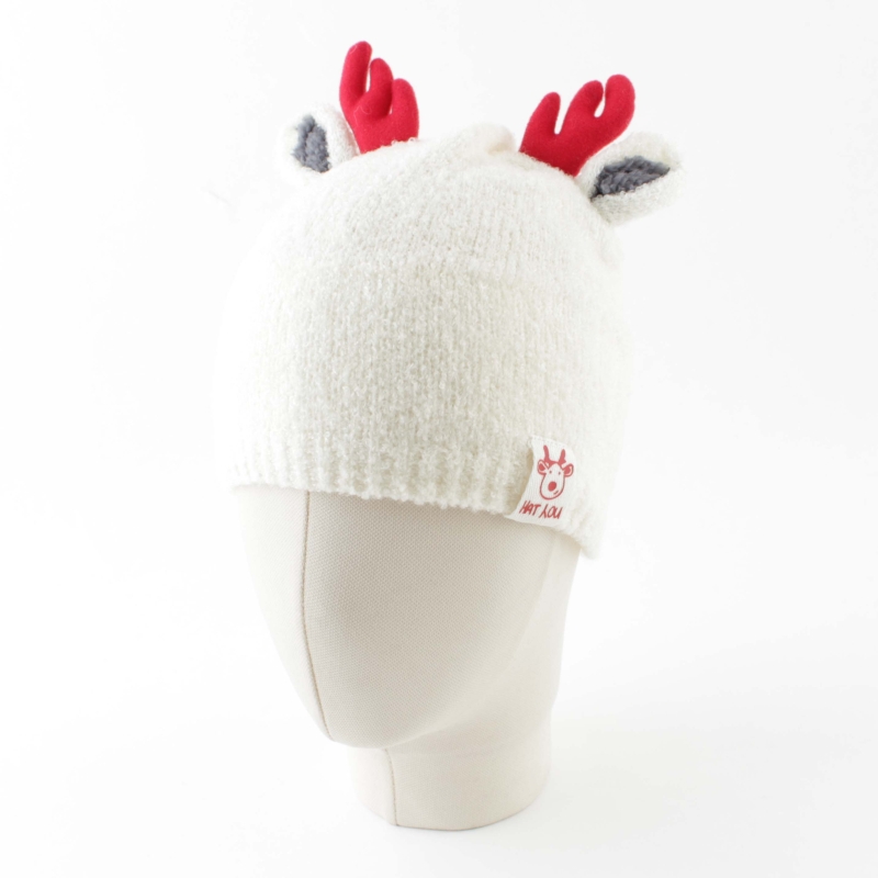 Kids’ knitted hat in ecru with reindeer antlers and partial fleece lining.