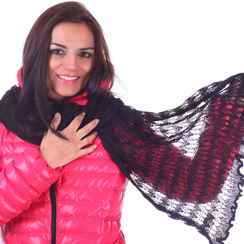 Fine ladies knitted scarf made of 30% mohair, 47% acrylic and 23% nylon.