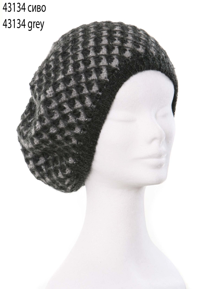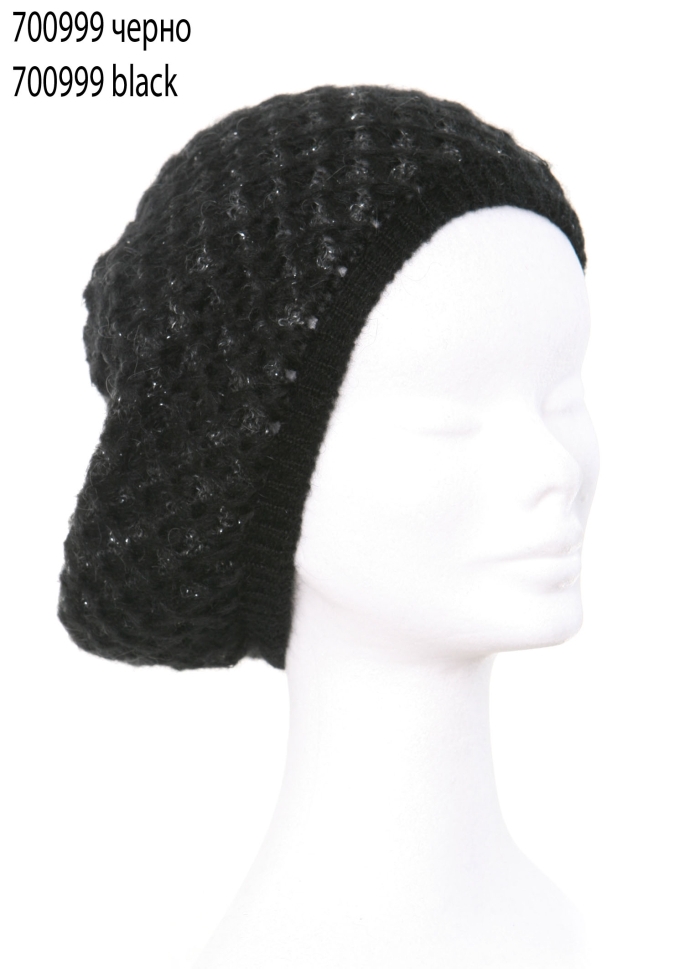 Soft knitted ladies hat with silver lamé made of 30% mohair, 40% acrylic and 30% polyamide.