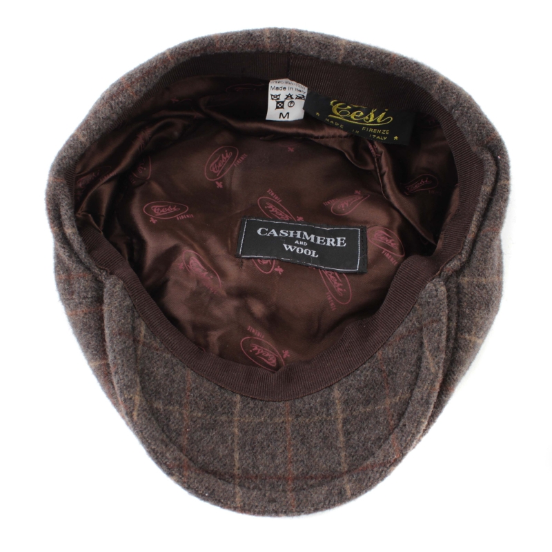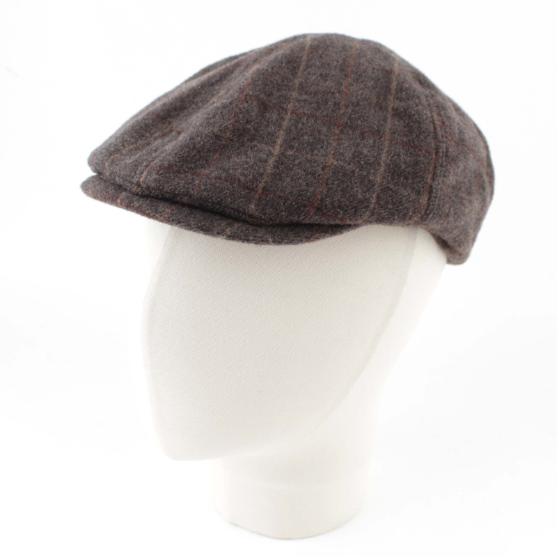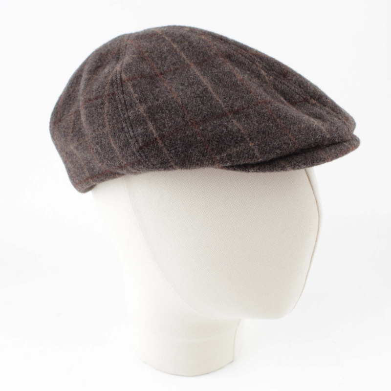 Men’s flat cap made from a wool-blend fabric in brown check pattern.