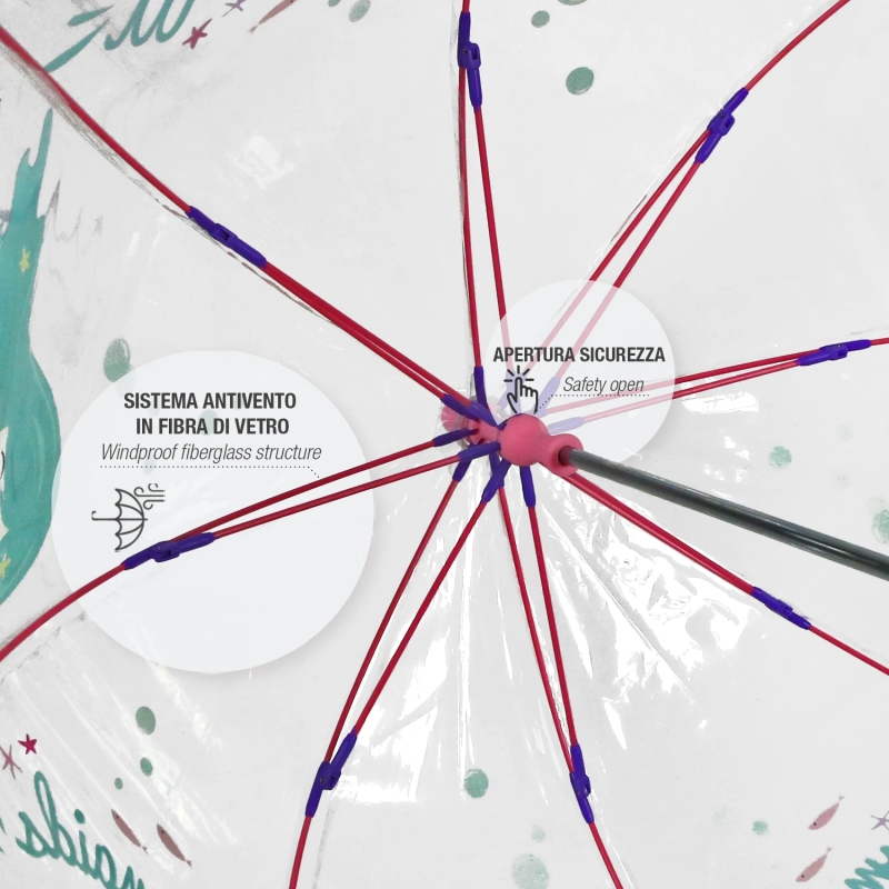 Kid's transparent manuale and non-folding umbrella with reflective edging from the Perletti CoolKids line.