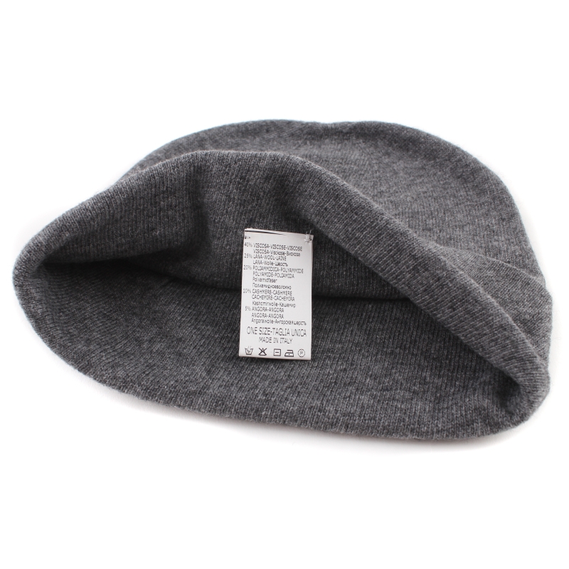 Men's knitted hat with smooth and elastic knit from fine yarn. The hat is seamless, double knitted and with a comfortable board. The model can be worn as a falling back hat or with the board facing outwards so that it stands on the head. Composition: 40% viscose, 25% wool, 20% polyamide, 10% cashmere and 5% angora. Size: suitable for sizes from 55 cm to 59 cm. Made in Italy.