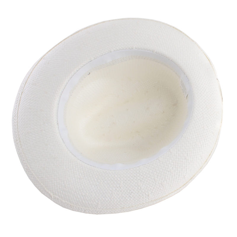 Summer men's hat type fedora in white with decorative black ribbon. Width of the periphery - 6.5 cm, height of the dome at the highest point - 12 cm. Composition: light and non-steaming material - 100% paper rope. Dimensions: available in sizes 55, 57, 59 and 61 cm.