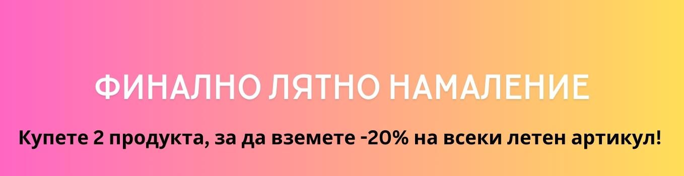 В периода 1 - 30 септември 2023 г. при покупка на 2 и повече продукта от shalovete.com, ще получите 20% отстъпка от цената на всеки артикул от лятната колекция в кошницата си. Отстъпката се изчислява автоматично, когато сложите втори продукт в количката си. Тя важи единствено за летни шалове, летни шапки и плажни чанти. Не е необходимо двата продукта да са от лятната колекция. Но когато в кошницата Ви има и продукти, които не са от лятната колекция, ще получите намаление само за летния артикул.