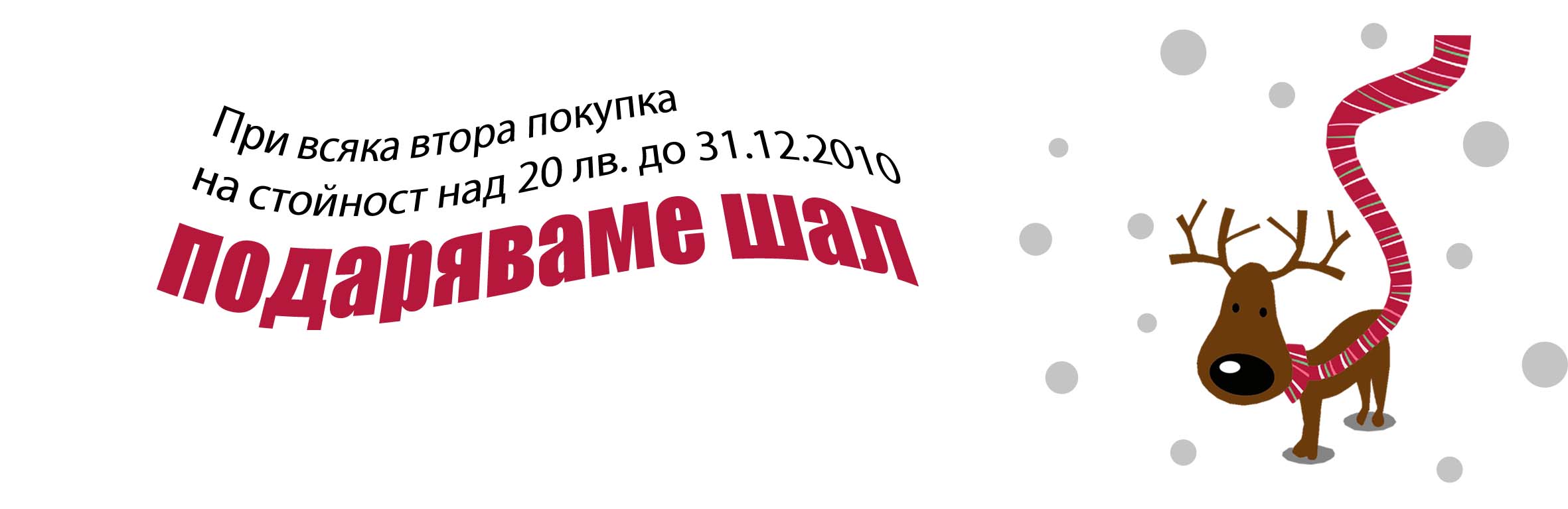 Между 12 ноември и 31 декември 2010 г. при всяка втора покупка на стойност над 20 лв., която направите в магазин ШАЛОВЕТЕ на ул. Парчевич 39 в София или онлайн на www.shalovete.com ще Ви подарим шал!