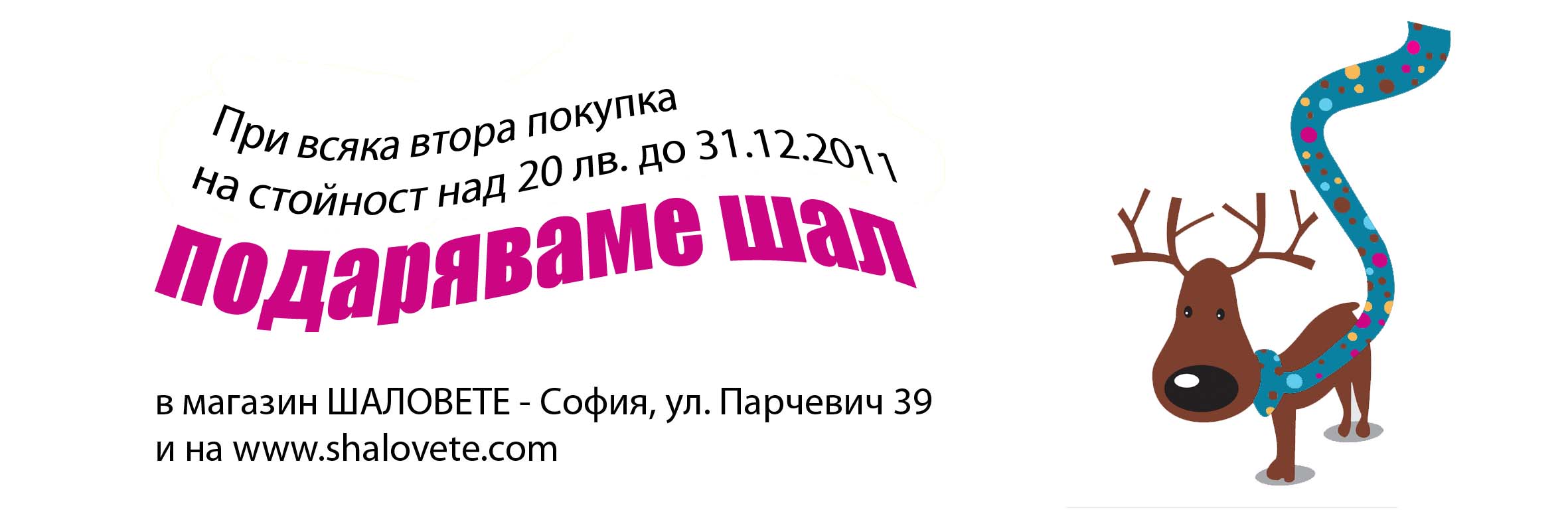 Между 21 ноември 2011 г. и 10 януари 2012 г. при всяка втора покупка на стойност над 20 лв., която направите в магазин ШАЛОВЕТЕ на ул. Парчевич 39 в София или онлайн на www.shalovete.com ще Ви подарим шал!