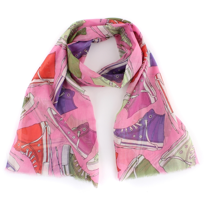 Фин памучен детски шал със свежарски мотив - разноцветни кецове. Състав: 100% памук. Размери: 50х160 см. Подходящ е за деца над 4 години.