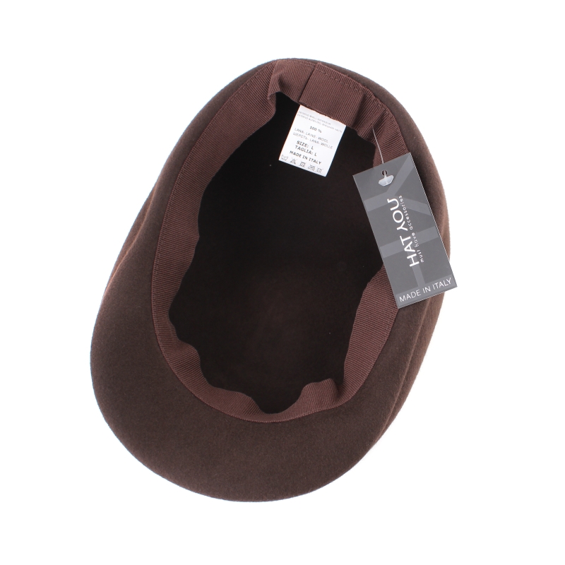 Класически вълнен филцов мъжки каскет в тъмнокафяво със заоблен формован купол. Състав: 100% вълна. Размери: предлага се в размер S/56 см, M/57 см, L/58-59 см. Произведен в Италия.