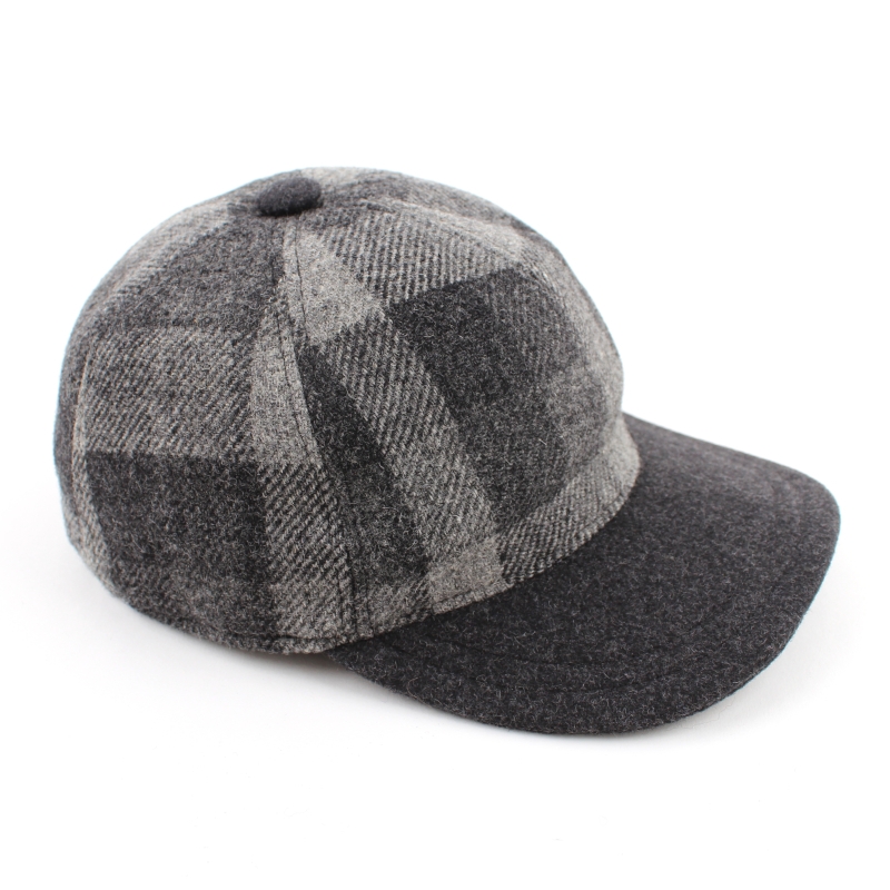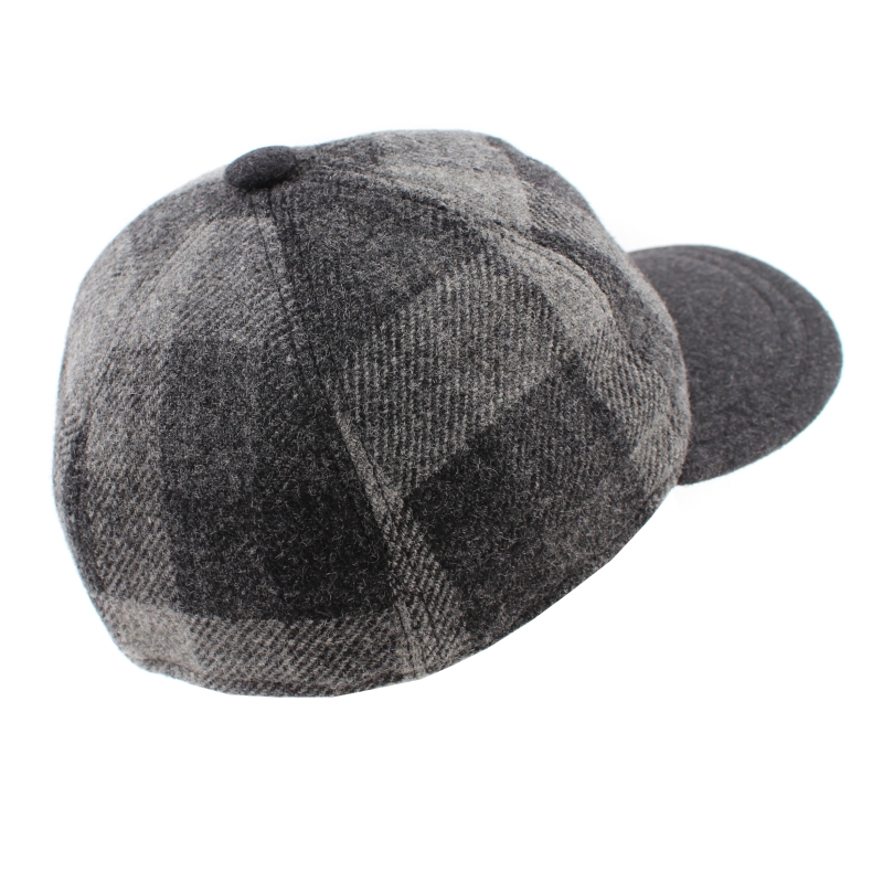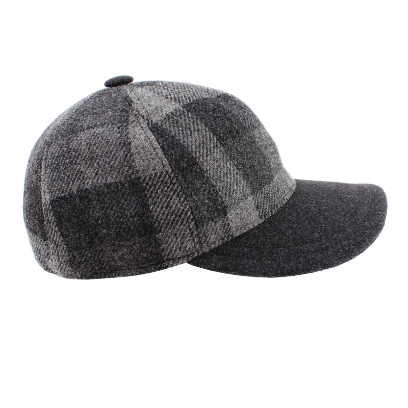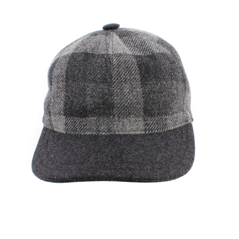 Зимна бейзболна шапка с купол от вълнен плат в сиво каре и едноцветна козирка. Състав: плат каре - 100% вълна, плат козирка -  70% вълна и 30% полиестер. Капитонирана подплата от 100% полиестер. Предлага се в размер М/57 - 58 см/, L/58 - 59,5 см/. Произведена в Италия.