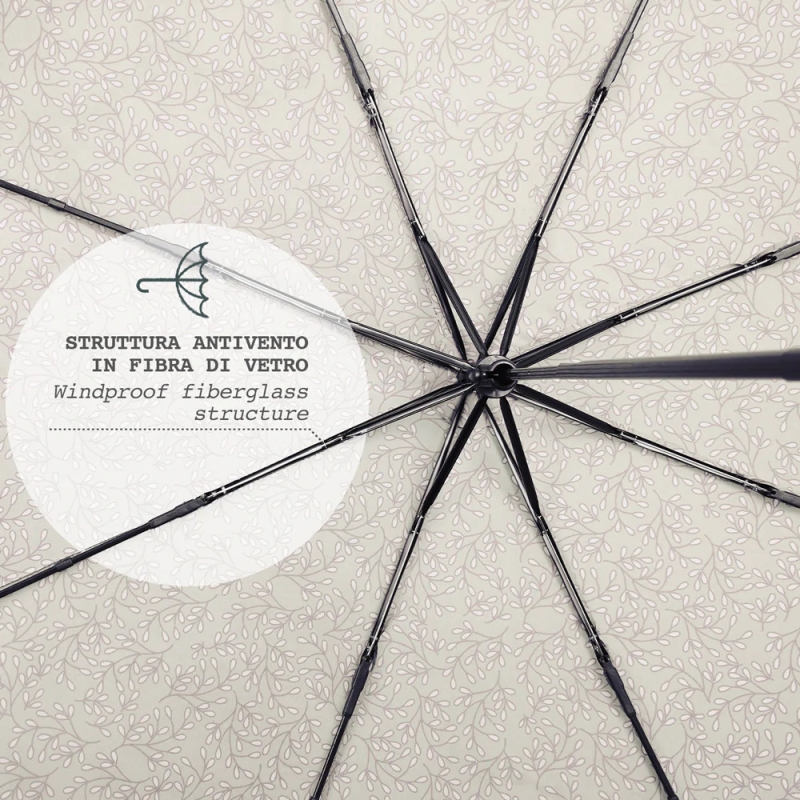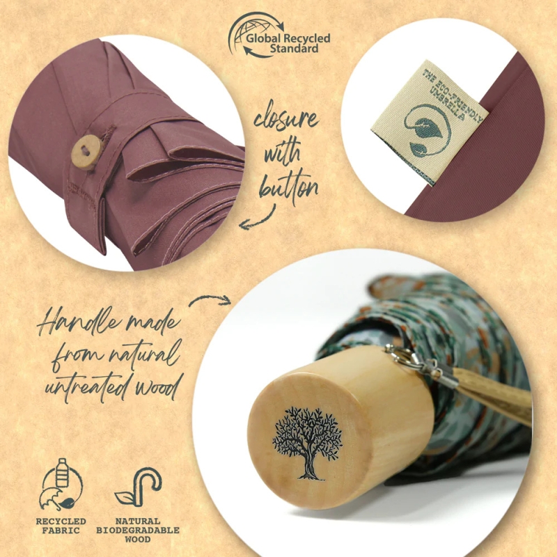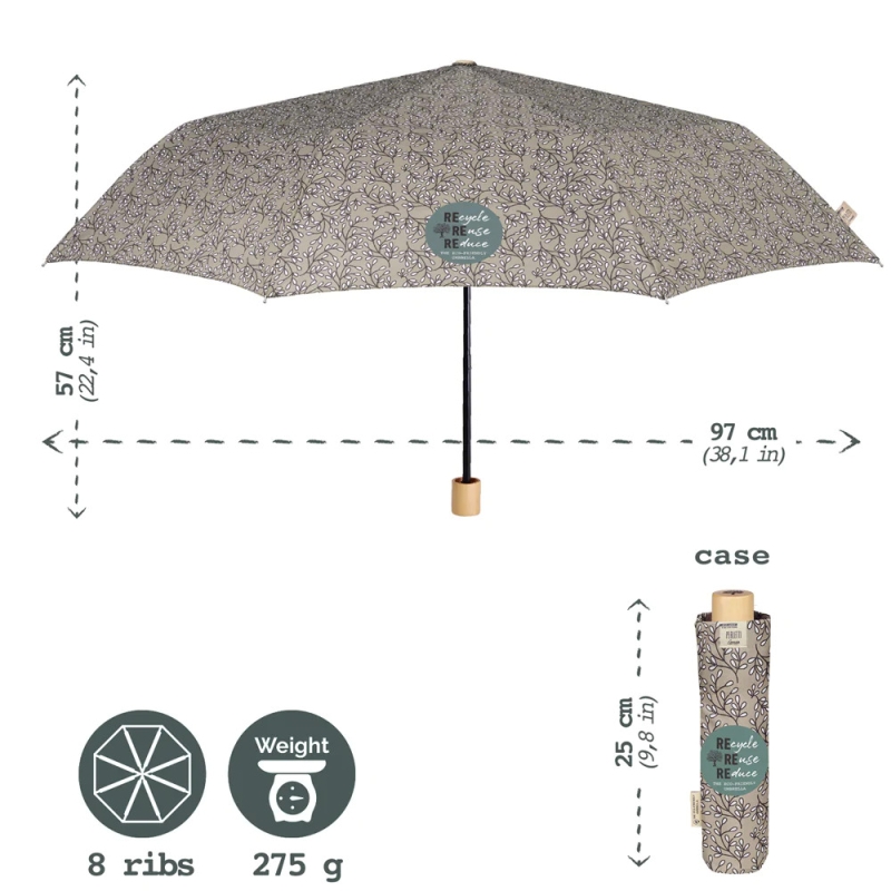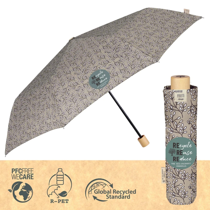 Дамски неавтоматичен сгъваем чадър от линията Perletti Green. Гъвкава и ултралека ветроустойчива структура от фибросъкло. Ергономична дръжка от биоразградима дървесина.