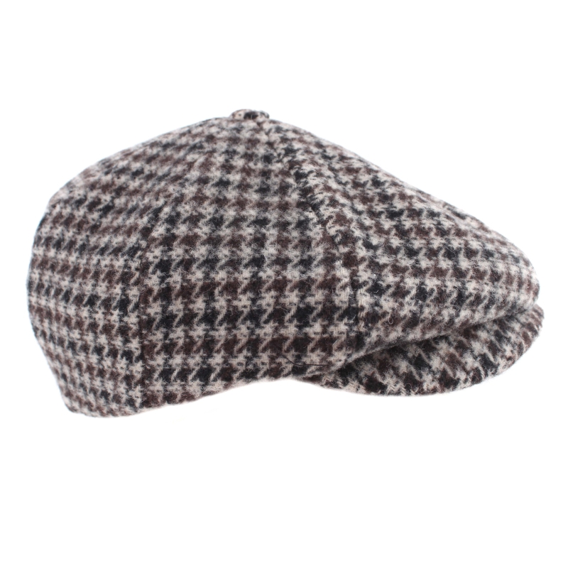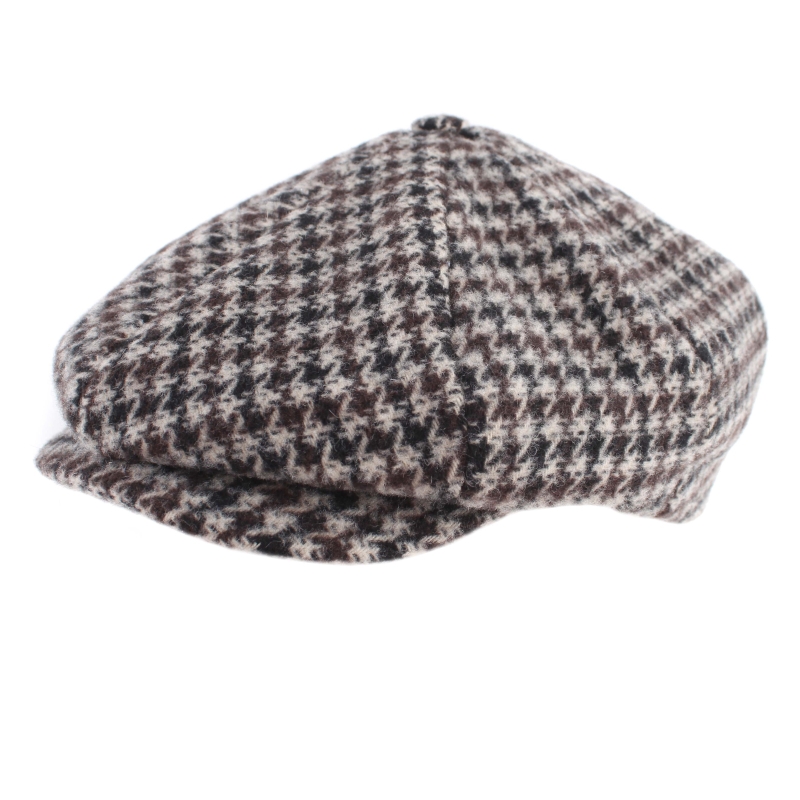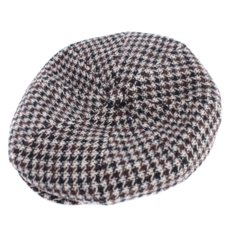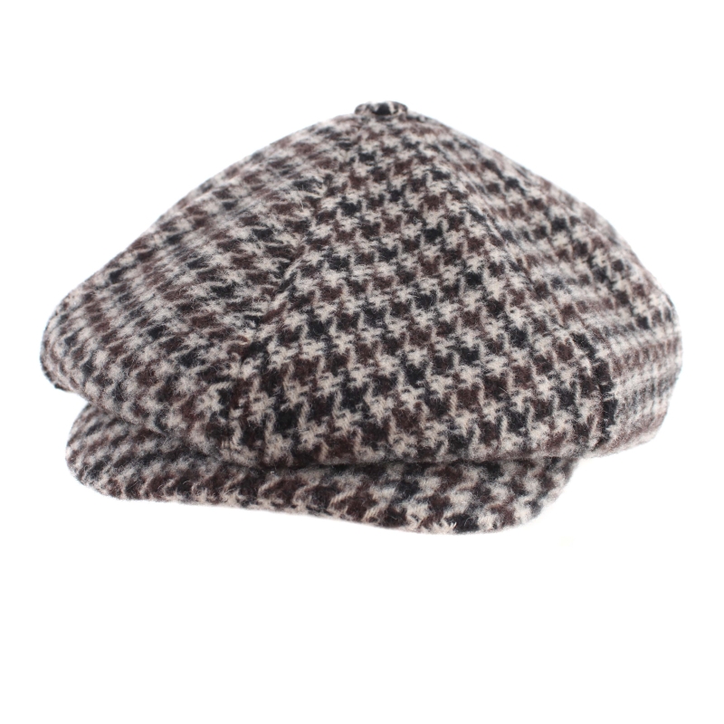 Мъжки каскет с твърда козирка и купол от осем парчета в бежовокафяв пепит. Състав: 50% полиакрил, 25% полиестер, 20% вълна, 5% други влакна, капитонирана подплата от 100% полиестер. Размер: предлага се в размери M/56-57 см и L/58-59 см. Произведен в Италия.