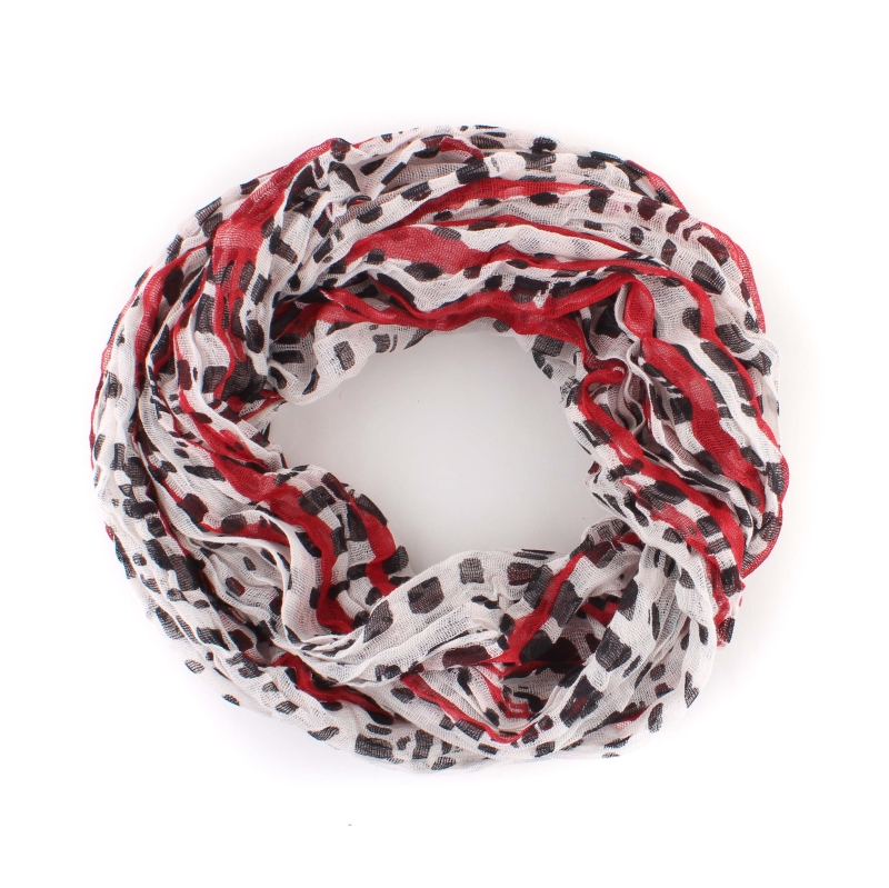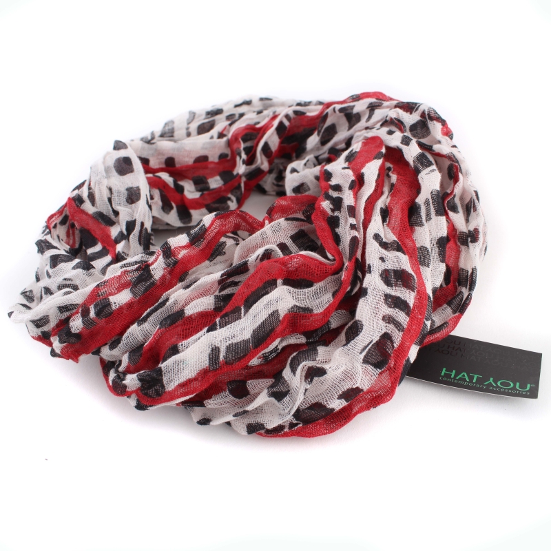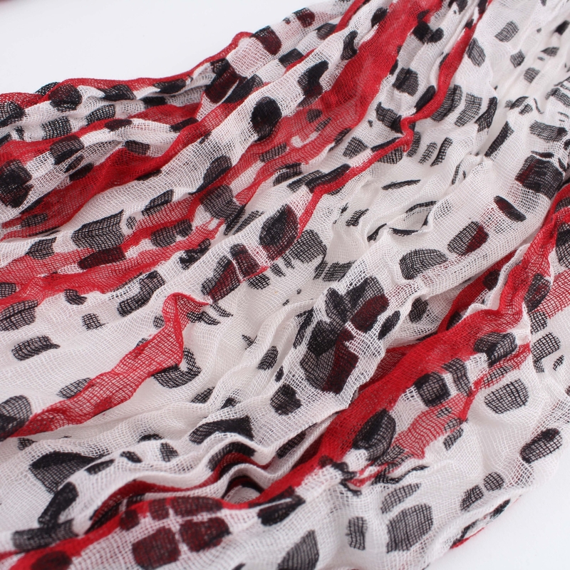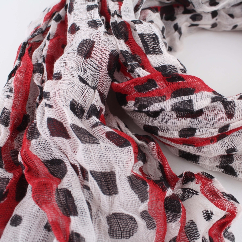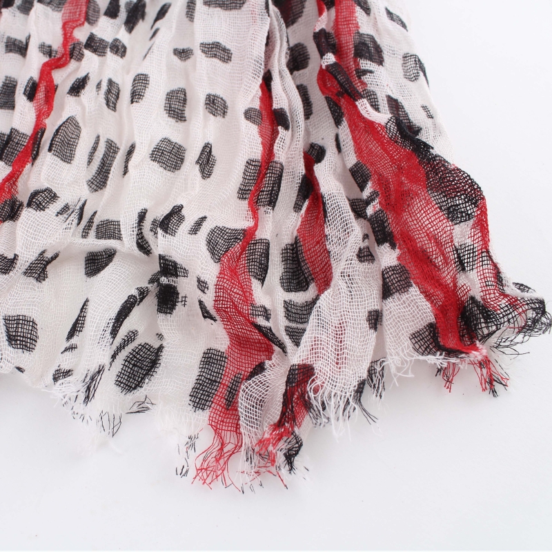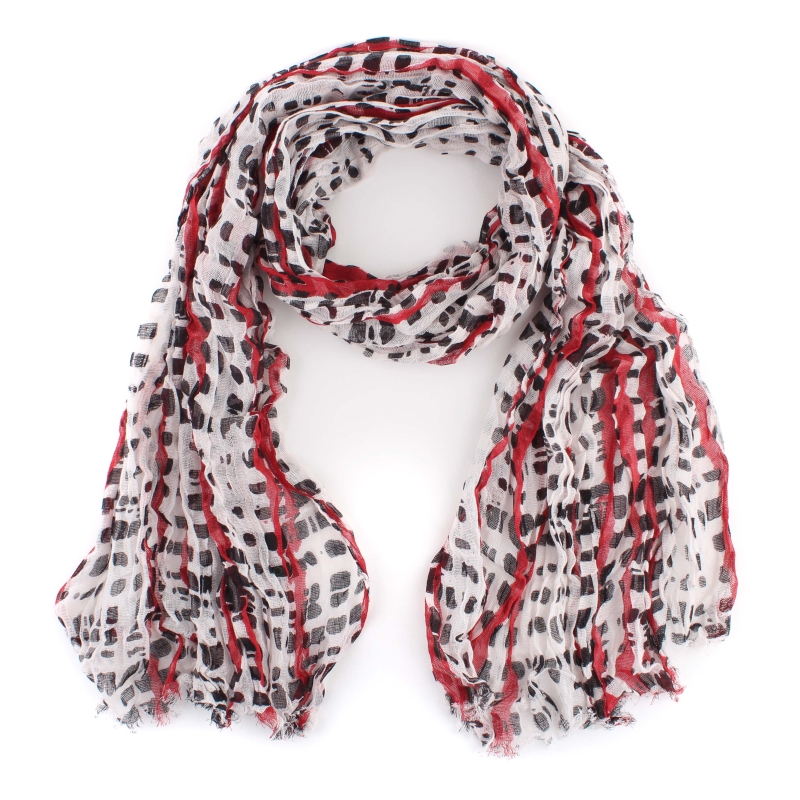 Летен шал от рехава памучна материя с мотив червени надлъжни линии и черни петна.