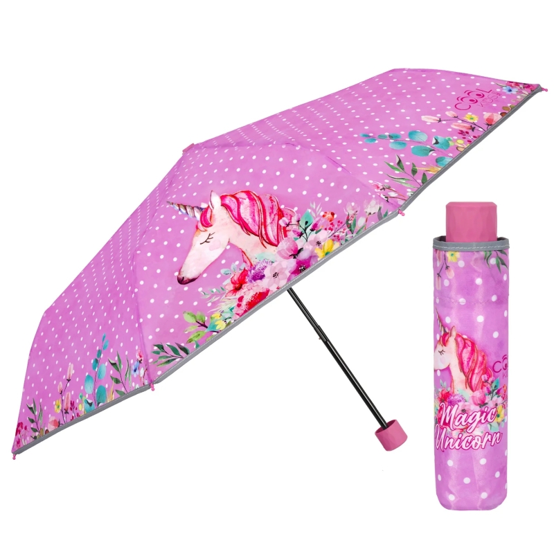 Момичешки сгъваем чадър с удобен размер, за да се побира лесно в чанта или раница. Сладурски мотив с еднорог в лилаво. Светлоотразителен кант гарантиращ висока видимост на чадъра в по-тъмните дни. Спици от фибростъкло за отлична устойчивост на силните пориви на вятъра.