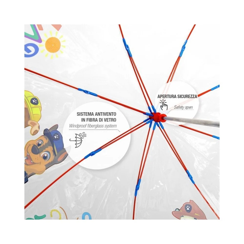 Детски прозрачен неавтоматичен и несгъваем чадър с героите на Пес Патрул (Paw Patrol) от серията Perletti Kids. Ветроустойчиви спици от фибростъкло със заоблени краища за осигуряване на по-голяма сигурност, гъвкавост и здравина. Диаметър - 64 см, несгъваема дръжка с дължина - 60 см, плат - 8 сегмента от 100% полиетилен. Тегло: 215 гр.