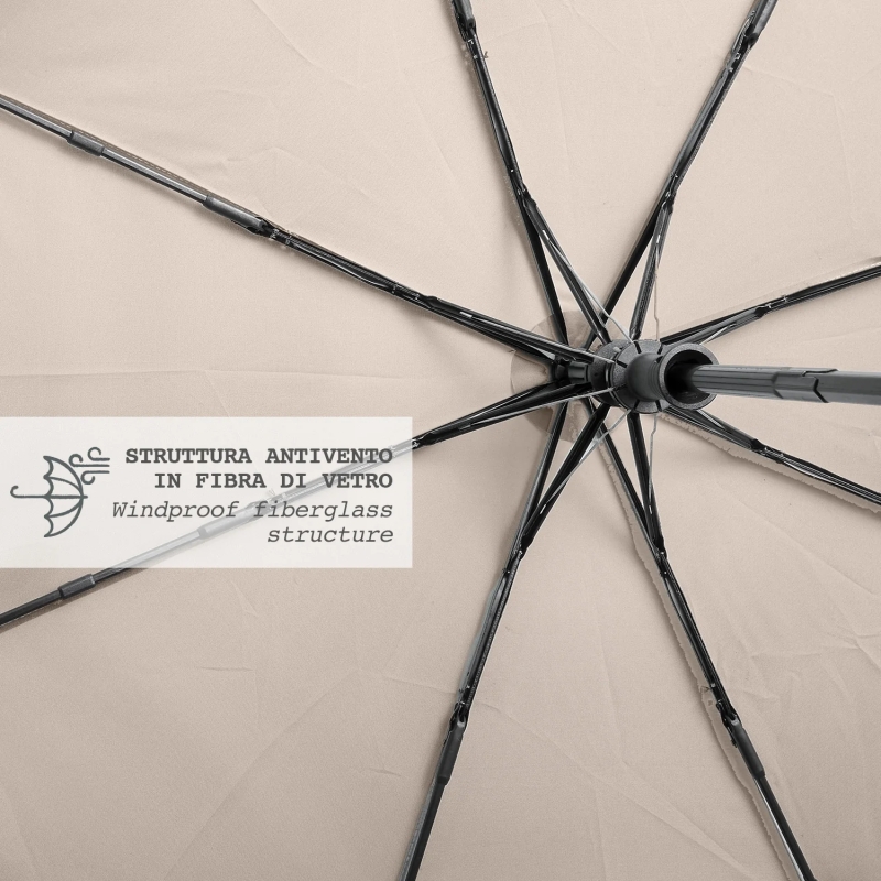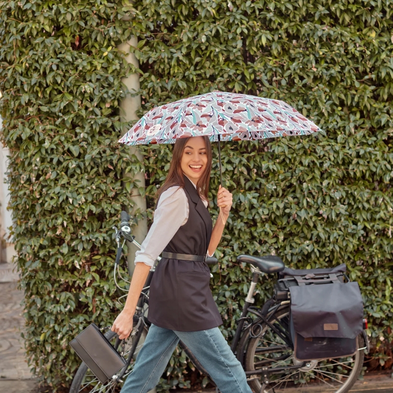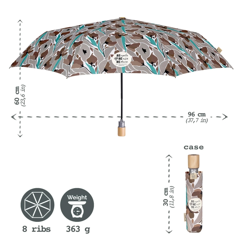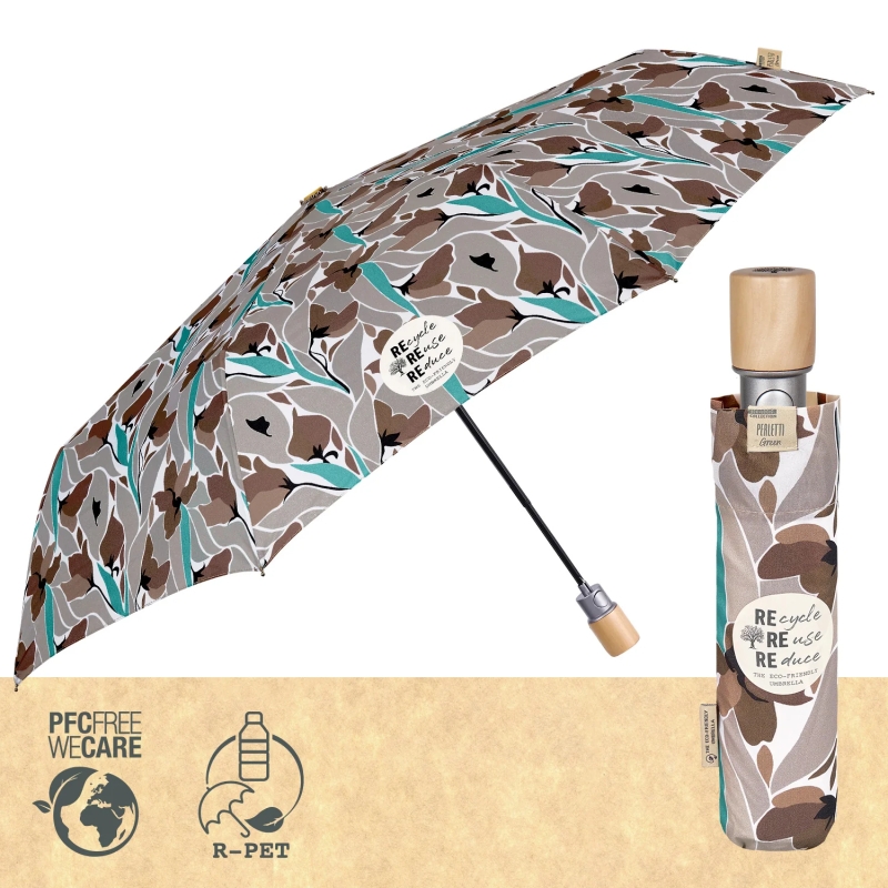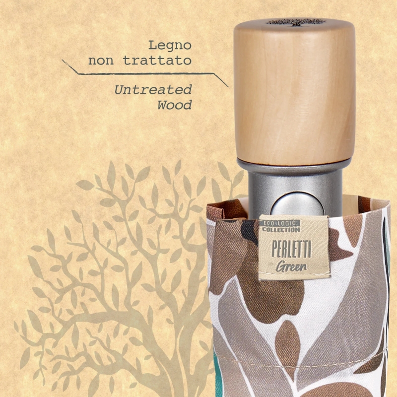 3-секционен сгъваем дамски чадър с автоматично отваряне от еколинията Perletti Green. Ветроустойчива структура със спици от фибростъкло, които правят чадъра издръжлив и същевременно практичен и лек. Бързосъхнеща хидроотблъскваща P-PET материя за опазване на околната среда и намаляване на отпадъците. Биоразградима дръжка от естествена дървесина.