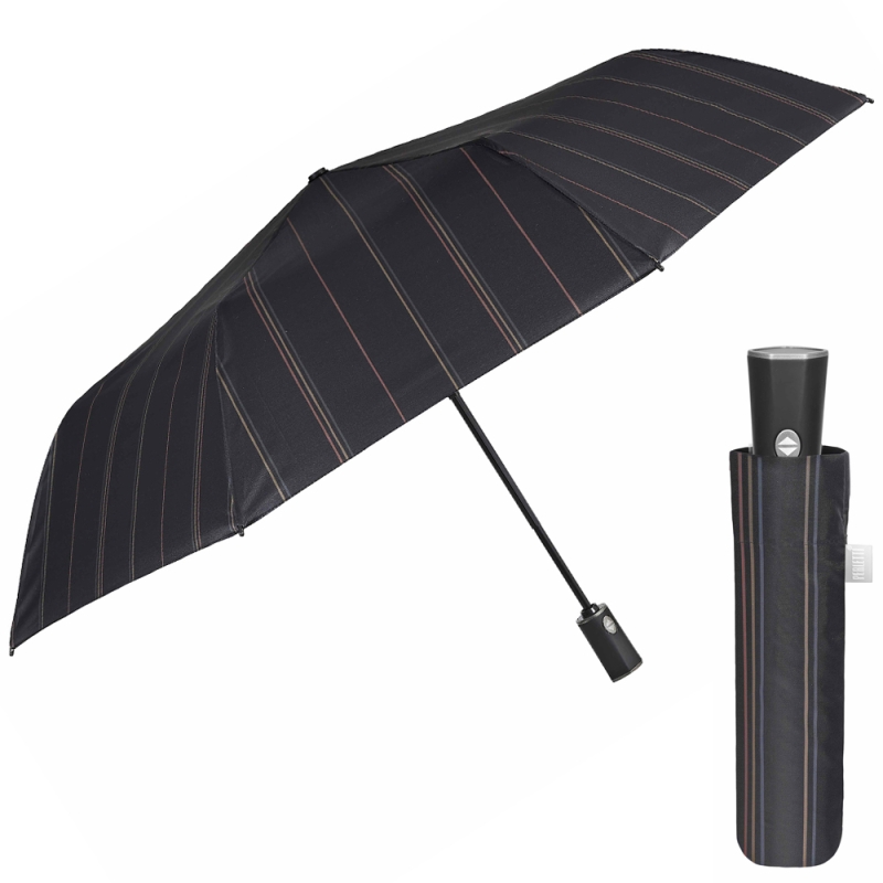 Сгъваем 3-секционен мъжки чадър с автоматично отваряне и затваряне от линията Perletti Time. Гъвкава ветроустойчива олекотена структура със спици от фибростъкло. Плат от бързосъхнеща хидроотблъскваща PFCFREE микрофибърна материя. Удобна матова дръжка.