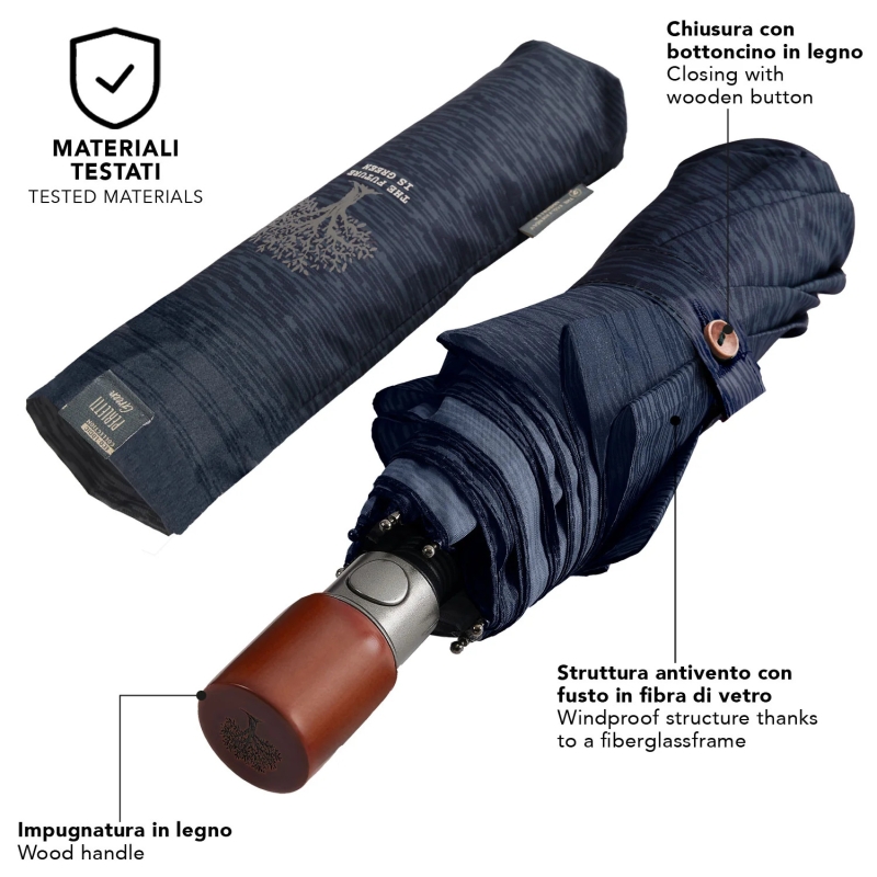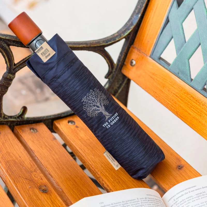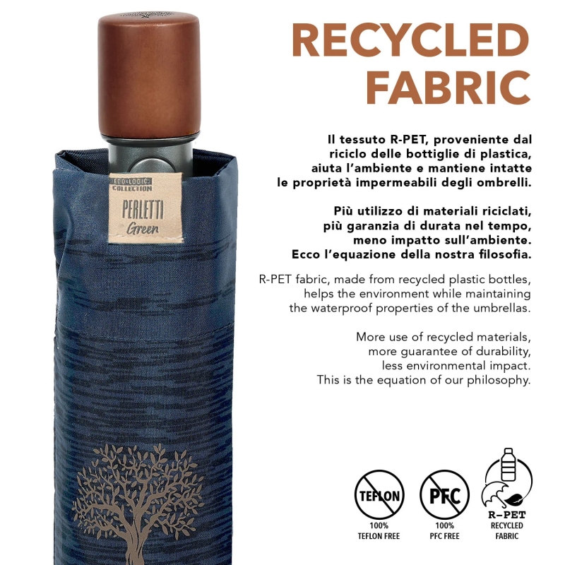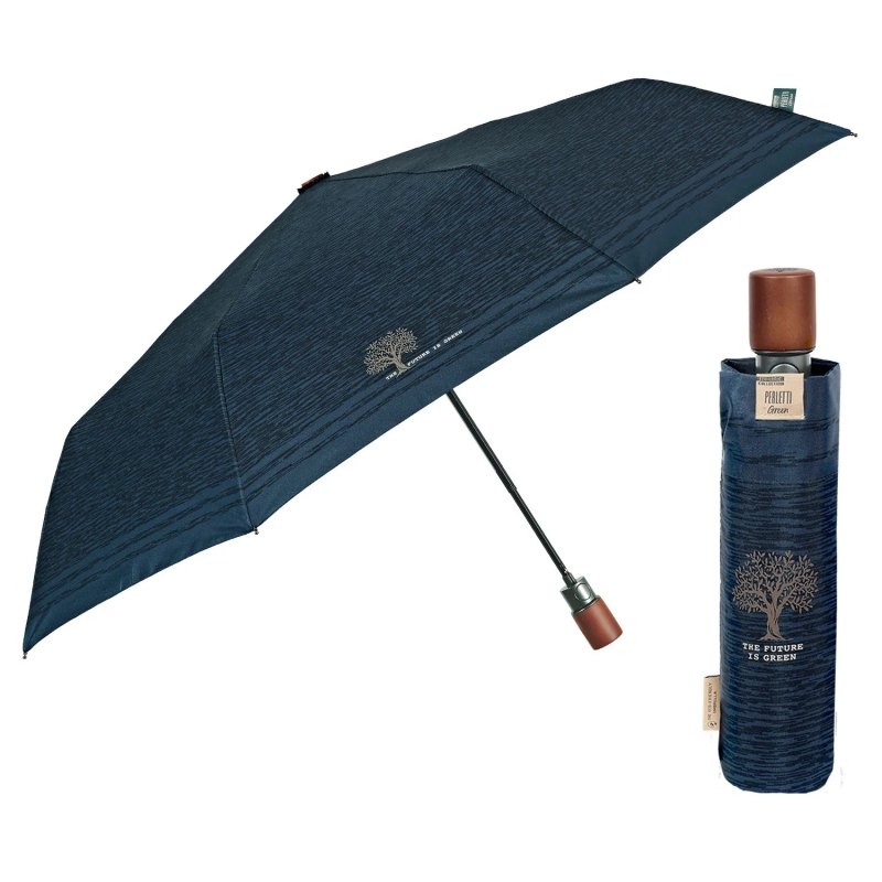 3-секционен сгъваем мъжки автоматичен чадър от еколинията Perletti Green с дръжка от дървесина и купол от рециклирана материя, създаден с грижа за околната среда и с мисъл за намаляване на отпадъците.