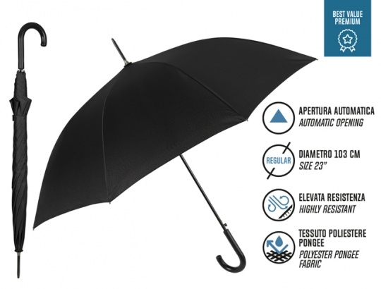 Несгъваем автоматичен премиум голф чадър с извита дръжка. Гъвкава и лека ветроустойчива структура от фибростъкло. Плат от бързосъхнеща хидроотблъскваща PFC Free микрофибърна материя. Диаметър - 103 см, дължина на дръжката - 84 см, тегло - 363 гр.