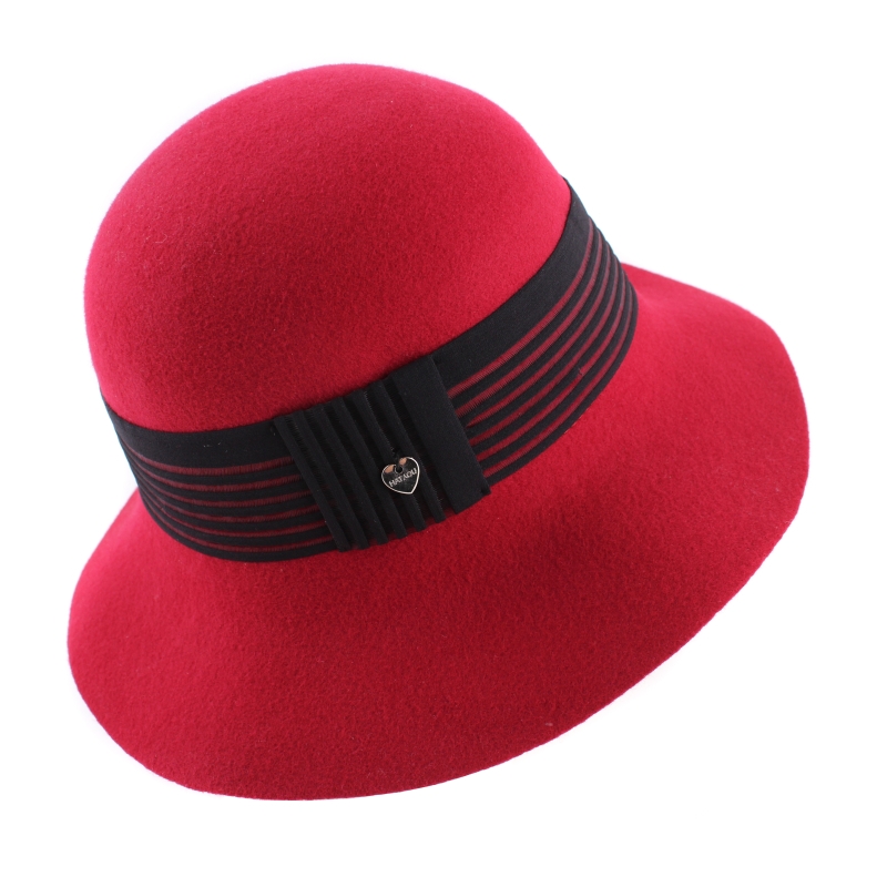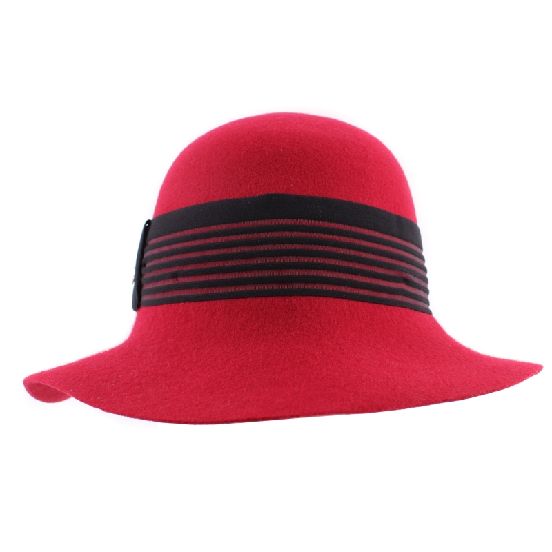 Елегантна филцова шапка в червено със средно широка периферия и декоративна черна лента. Широчина на периферията - 8 см. Височина на купола: 12 см. Състав: 100% вълна. Предлага се в един размер: 56 см. Произведена в Италия.