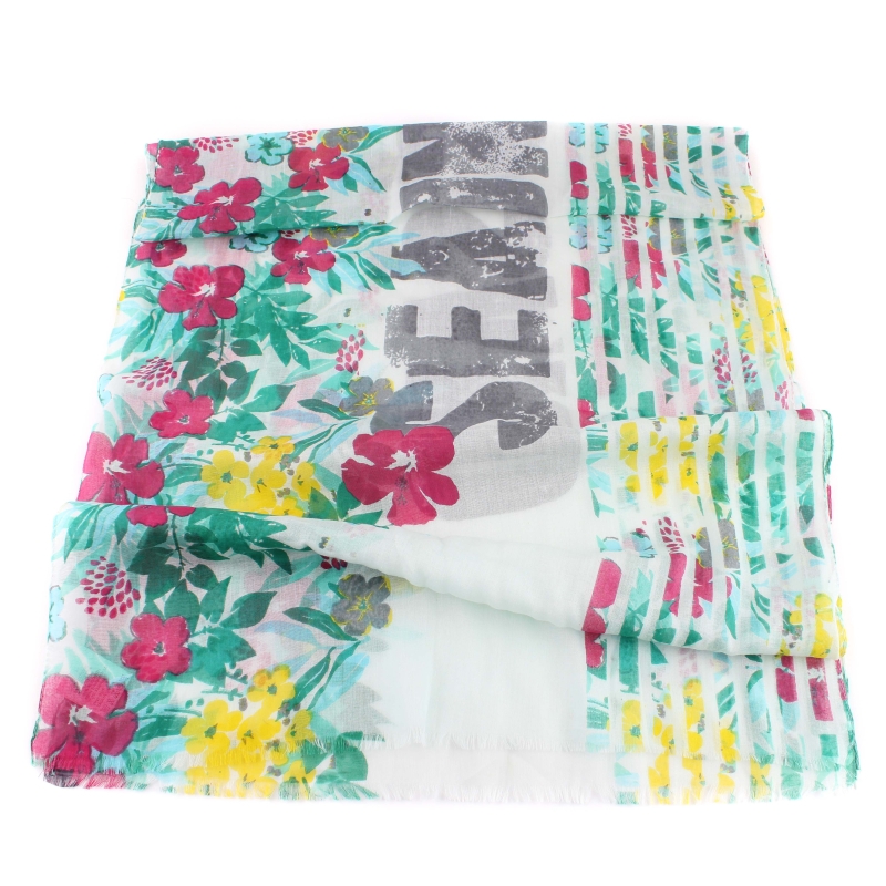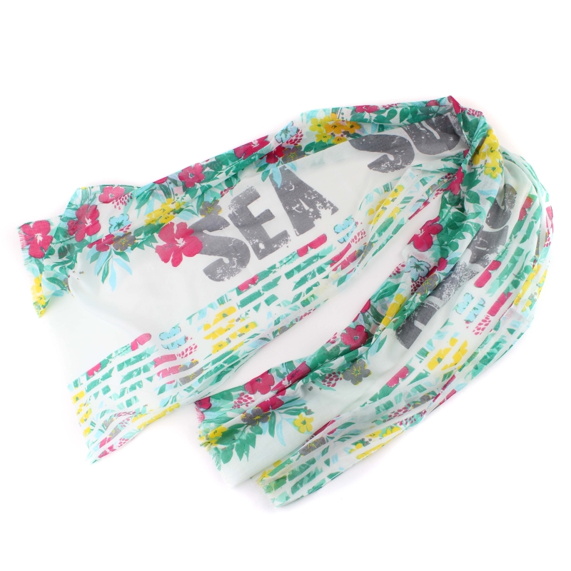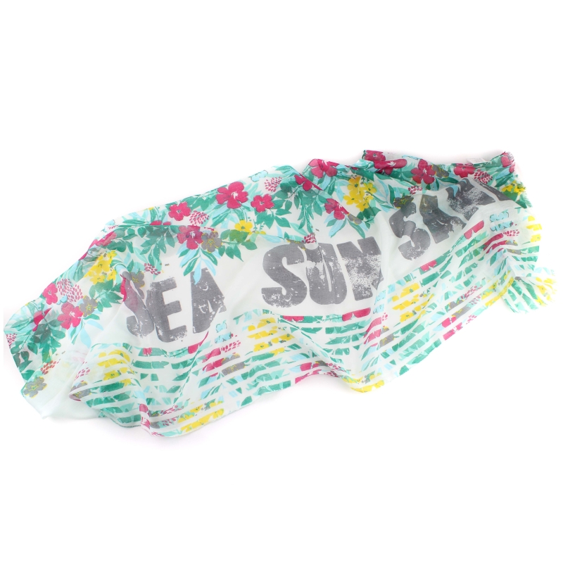 Eșarfă fină pentru copii din bumbac moale cu motiv hawaian și inscripția SEA SUN SAND.