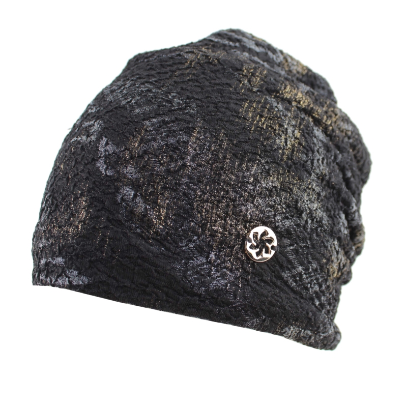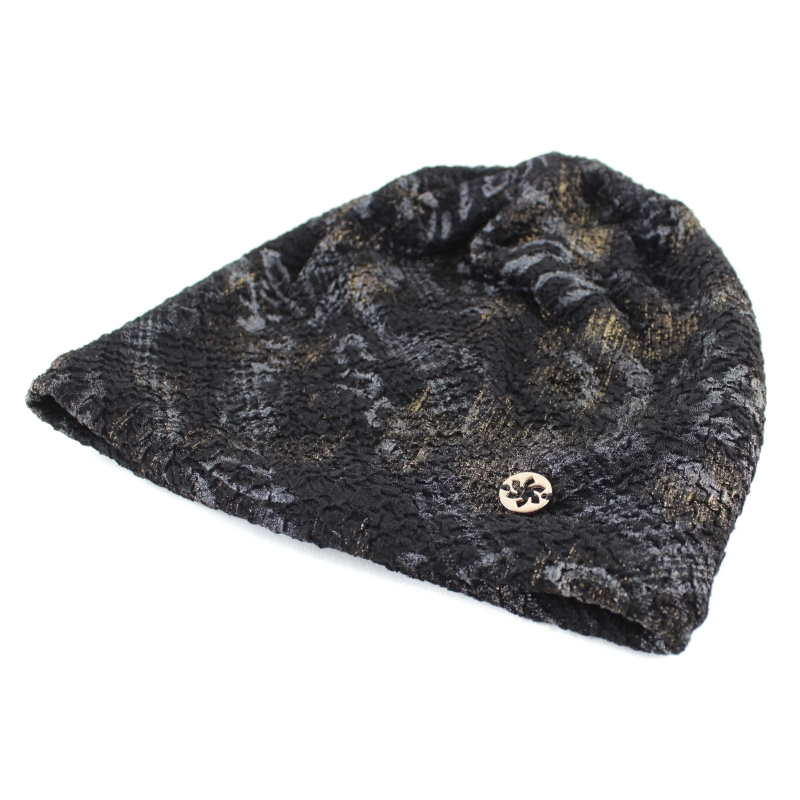 Set damă cu căciulă și fular circular, în culoare neagră, cu motiv animalier abstract în auriu și argintiu.